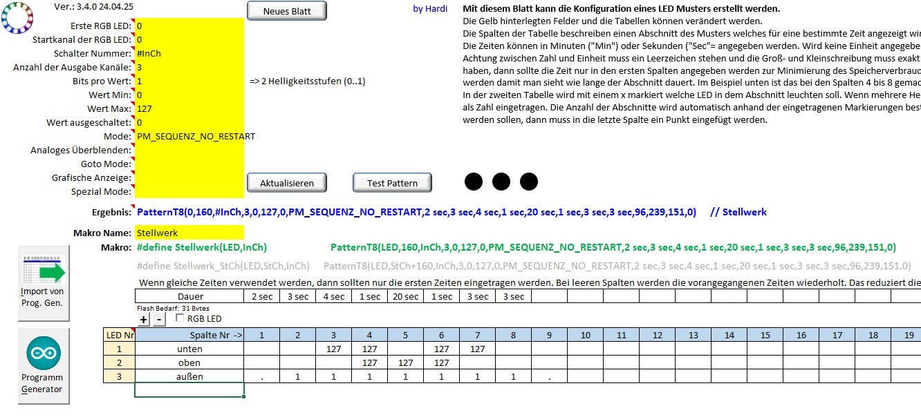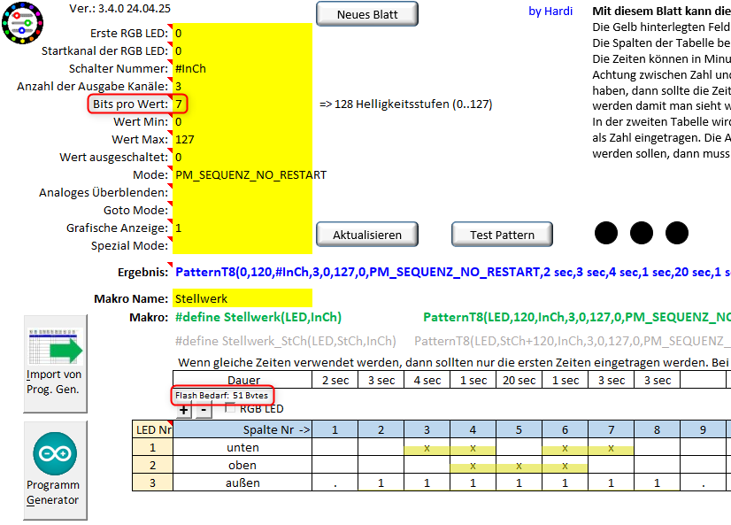 Wenn ich sie über den Programm-Generator ansteuere leuchten sie in der richtigen Helligkeit. Wenn ich den Ablauf über den Pattern-Configurator ausführe ist die LED "außen" viel zu hell. Eine Änderung des Werts bis herunter auf 1 brachte keinen Erfolg.