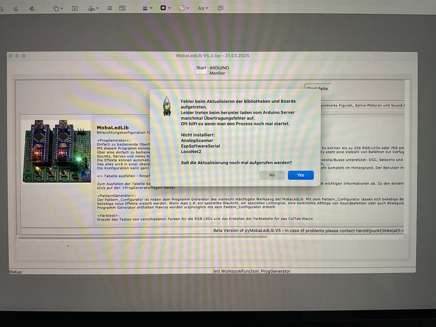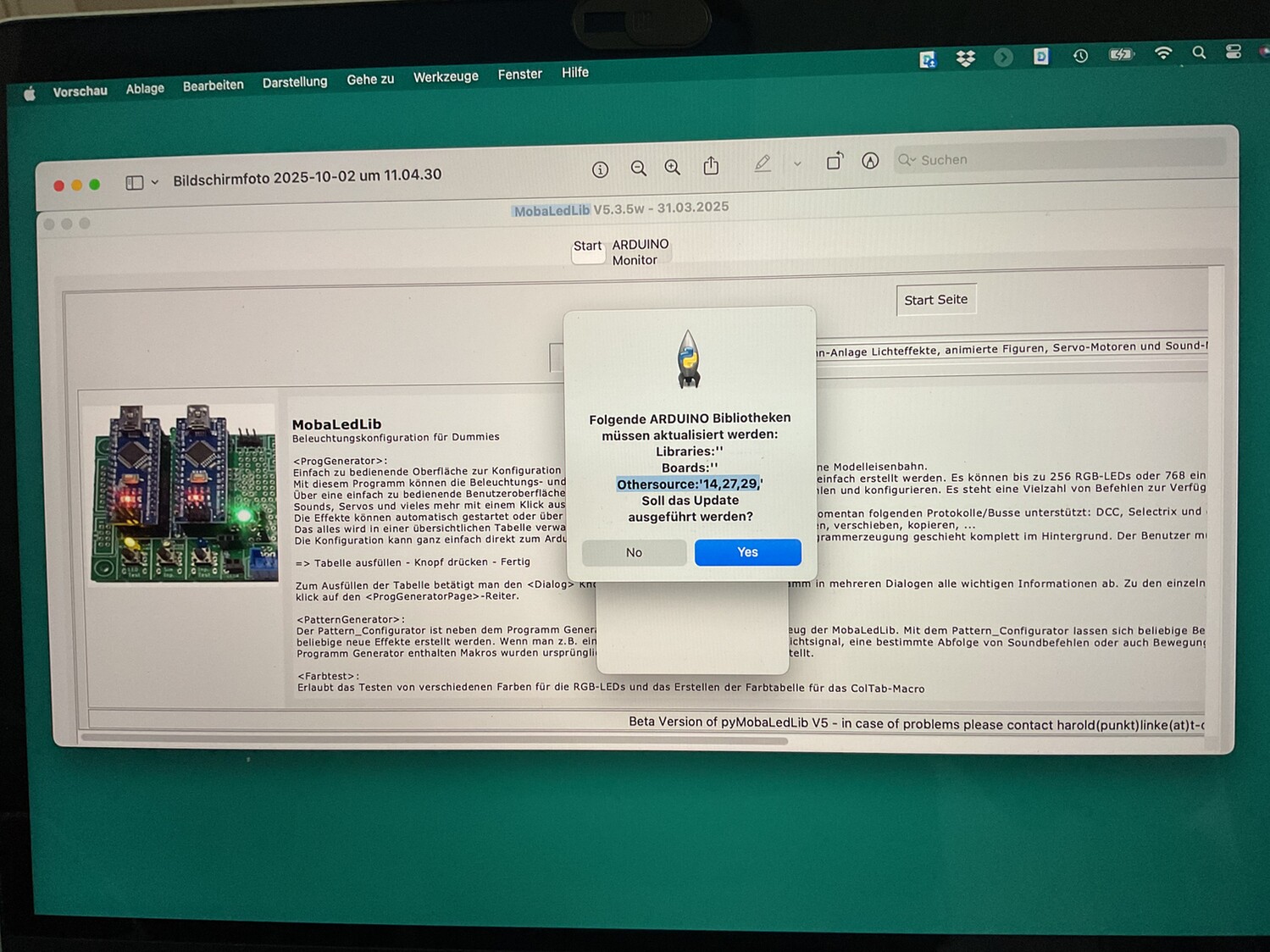 Beim Update der Bibilotheken wird mir auch anzeigt das '"MobaLedLib",'Boards:'' Othersource:'' aktualisiert werden sollen. Das Update läuft durch und wird im Arduino-Monitor mit grün angezeigt und der Info das nichts installiert wurde weil vorhanden.