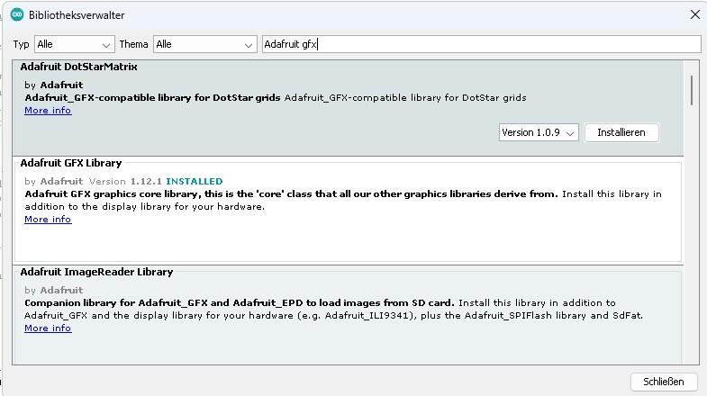 Über "Sketch - Bibliothek einbinden - finde ich nur Adafruit_SH110X oder nur SH1106. Beides versucht, mit anklicken einzubinden. Fehlermeldung beim Kompilieren bleibt die gleiche. Wenn ich die Bibliothek öffne, um diese "ADAFRUIT_SH1106.h zu suchen, findet er diese nicht, siehe Bild.