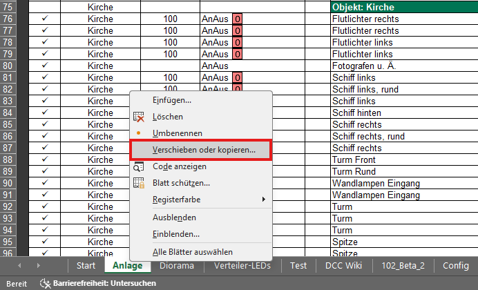 Um einen Teilbereich (hier die Kirche) zu exportieren, legt man sich zunächst eine Arbeitskopie des Excel-Sheets an.
