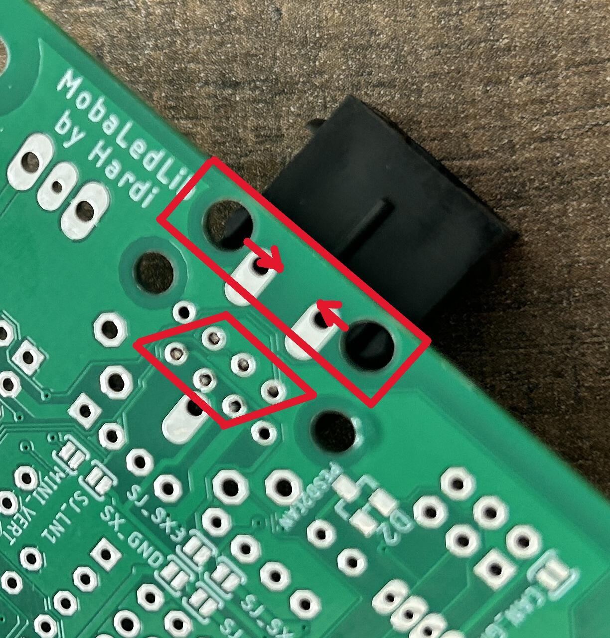 Die beiden vorderen Befestigungslöcher müssen mit einer Schlüsselfeile leicht nach innen verschoben werden. Der LNet-Anschluss ist 6-polig (RJ12), während die Leiterplatte für 8-polig (RJ54) ausgelegt ist. Die beiden äußeren Löcher werden für LNet nicht verwendet. (pin 1 und 8 von RJ54)