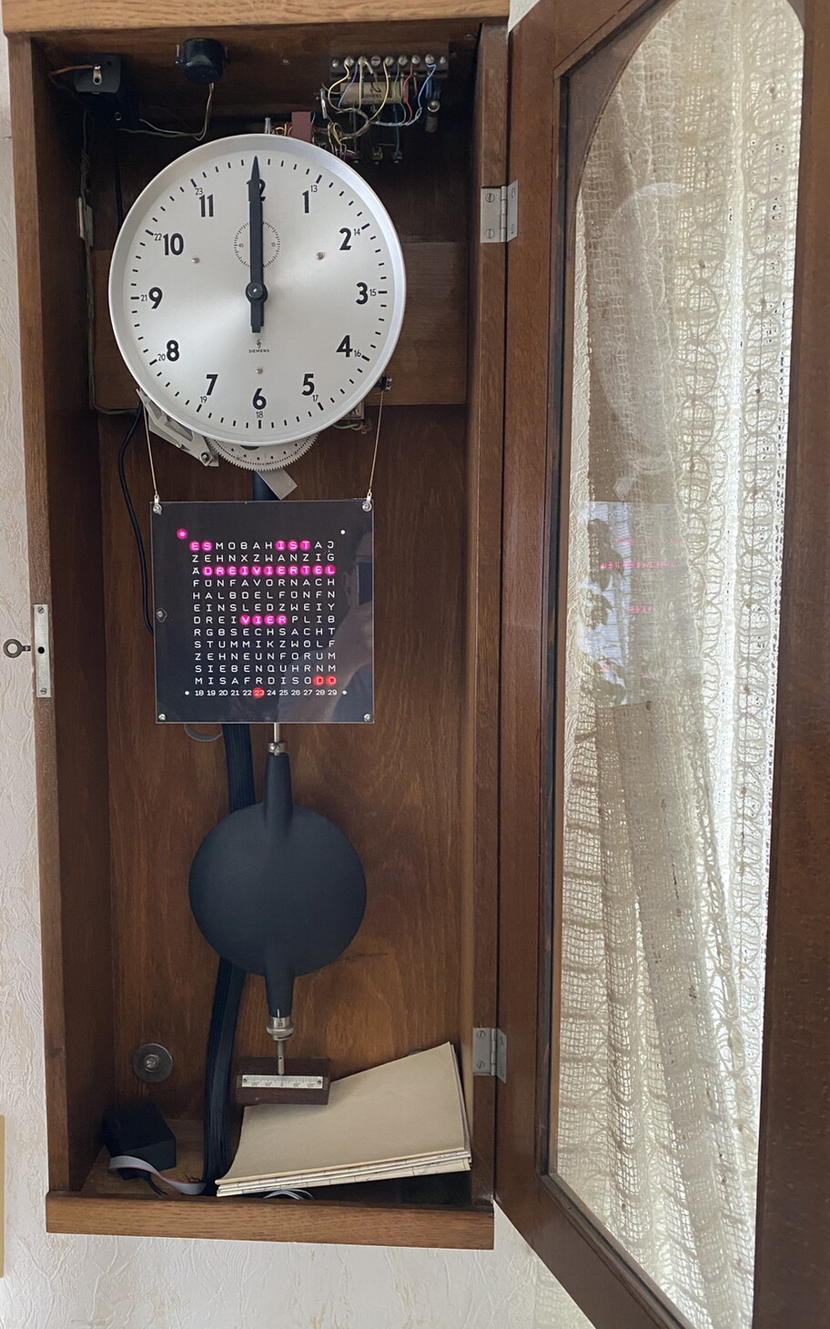 ich will hier 2 Bilder von meiner Wordclock zeigen. Ich hab sie in eine alte Siemens-Hauptuhr HU10im Holzgehäuse eingebaut. Die Hauptuhr geht nach fast 70 Jahren leider nicht mehr und die Wordclock übernimmt jetzt die Tätigkeit.