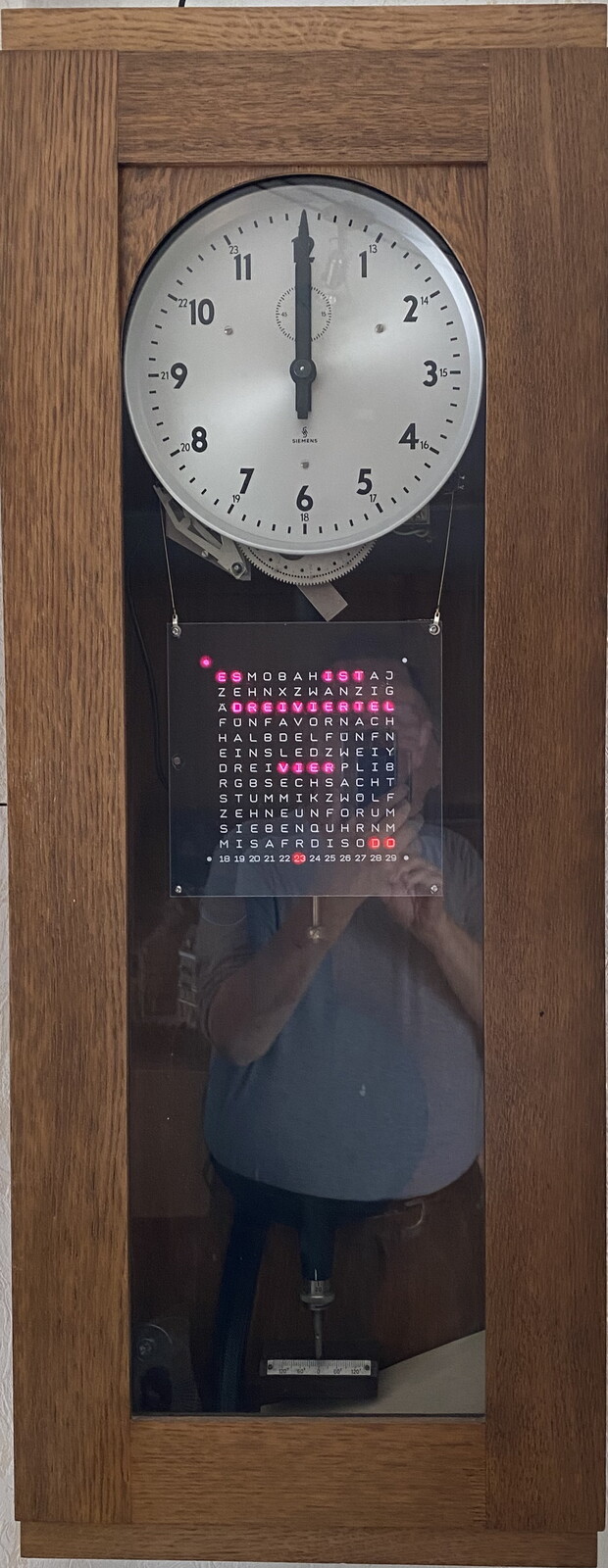 ich will hier 2 Bilder von meiner Wordclock zeigen. Ich hab sie in eine alte Siemens-Hauptuhr HU10im Holzgehäuse eingebaut. Die Hauptuhr geht nach fast 70 Jahren leider nicht mehr und die Wordclock übernimmt jetzt die Tätigkeit.