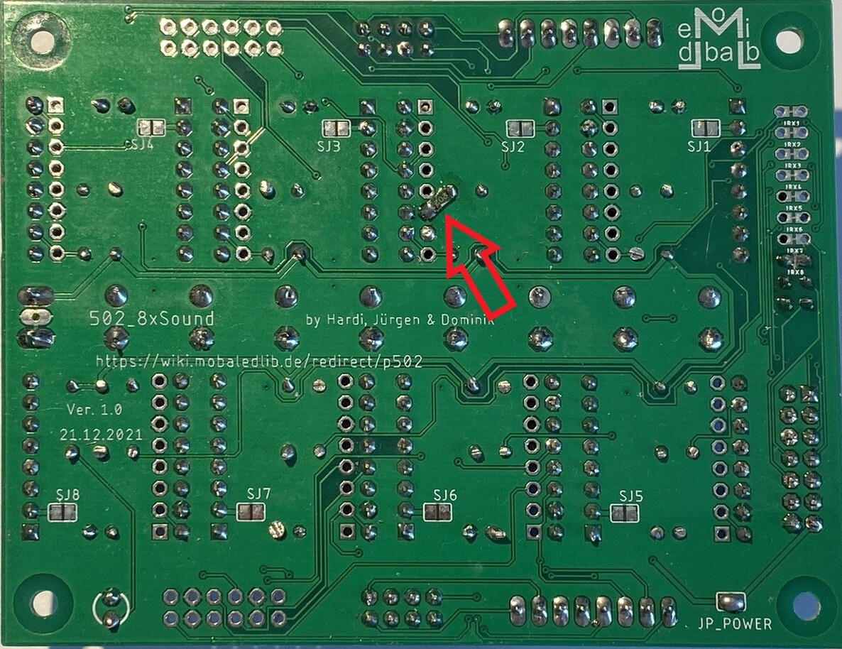 Hier hab ich noch 2 Bilder für die Änderung auf der 8-fach Soundplatine (502). Ich hab hier einen SMD-Widerstand mit 2k verwendet, aber es darf auch 2k2 sein.