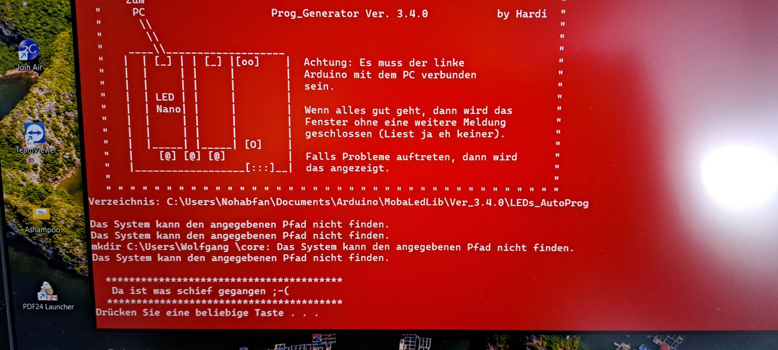 Unter dem User "Wolfgang", wo plötzlich Ordner wie "Core" in der Fehlermeldung des Arduino auftauchen, habe ich auch klar Schiff gemacht.
