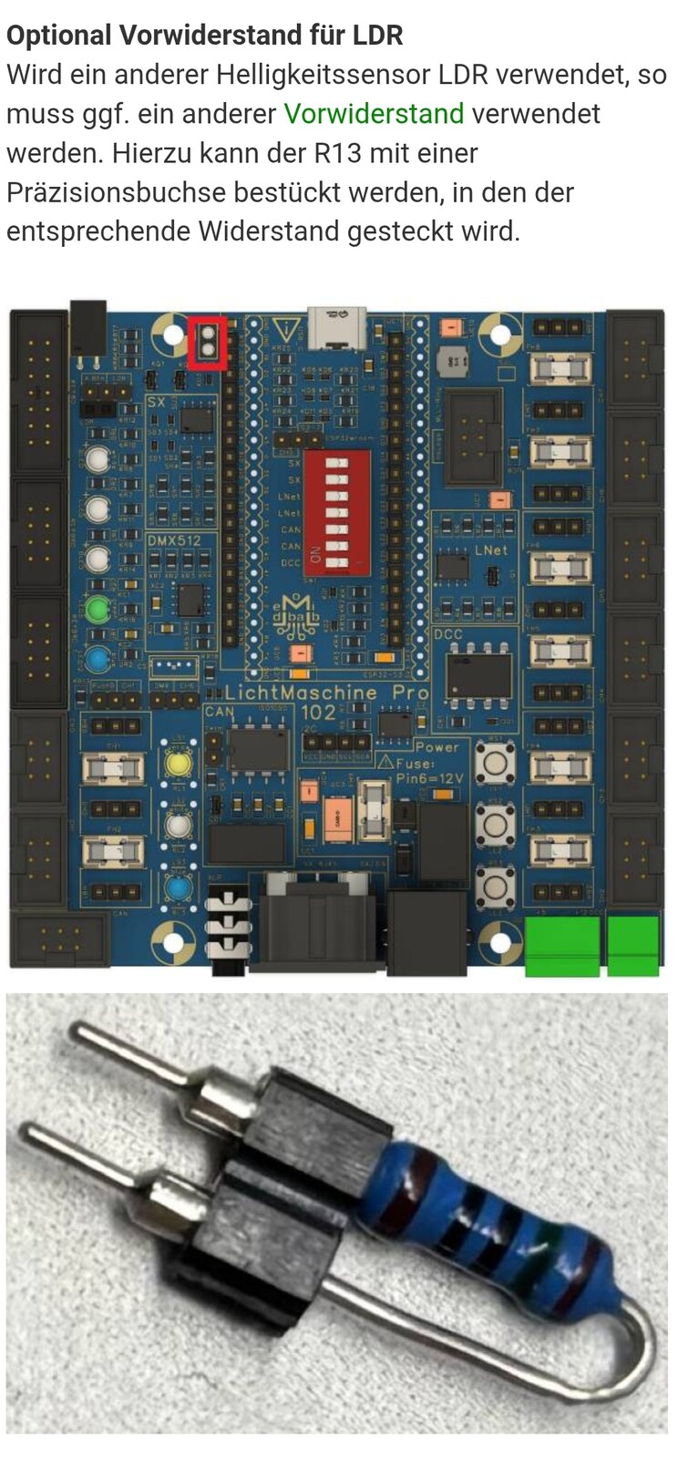 Wird ein anderer Helligkeitssensor LDR verwendet, so muss ggf. ein anderer Vorwiderstand verwendet werden. Hierzu kann der R13 mit einer Präzisionsbuchse bestückt werden, in den der entsprechende Widerstand gesteckt wird.