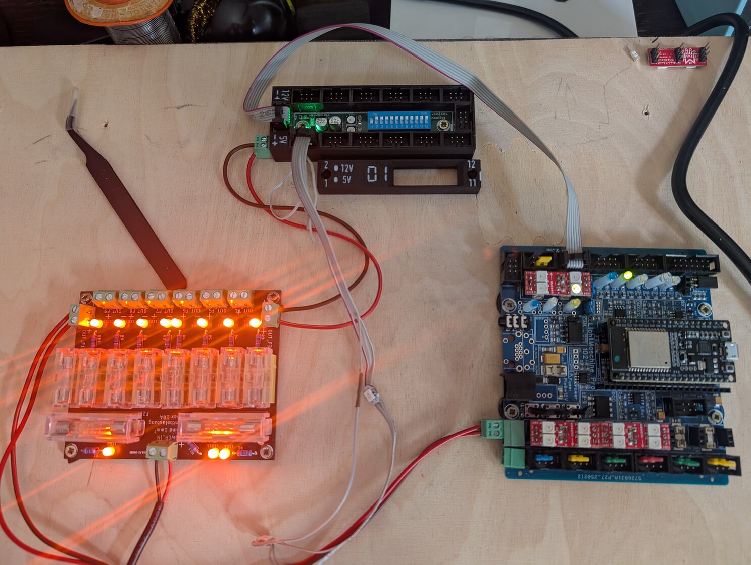 Hallo. Die Sicherung unter der Heartbeat LED auf der Lichtmaschine ist i.o. Der Heartbeat am CH 0 funktioniert. Ich habe mal ein 5V Netzteil an den Verteiler angeschlossen ohne die Matrix. Die 5V Anzeige leuchtet. Ich habe jetzt das Baustellenlicht am CH 0 auf der Lichtmaschine und das funktioniert einwandfrei. Nur der Verteiler will nicht.Auch nicht wenn der Dippschalter 1 auf On steht