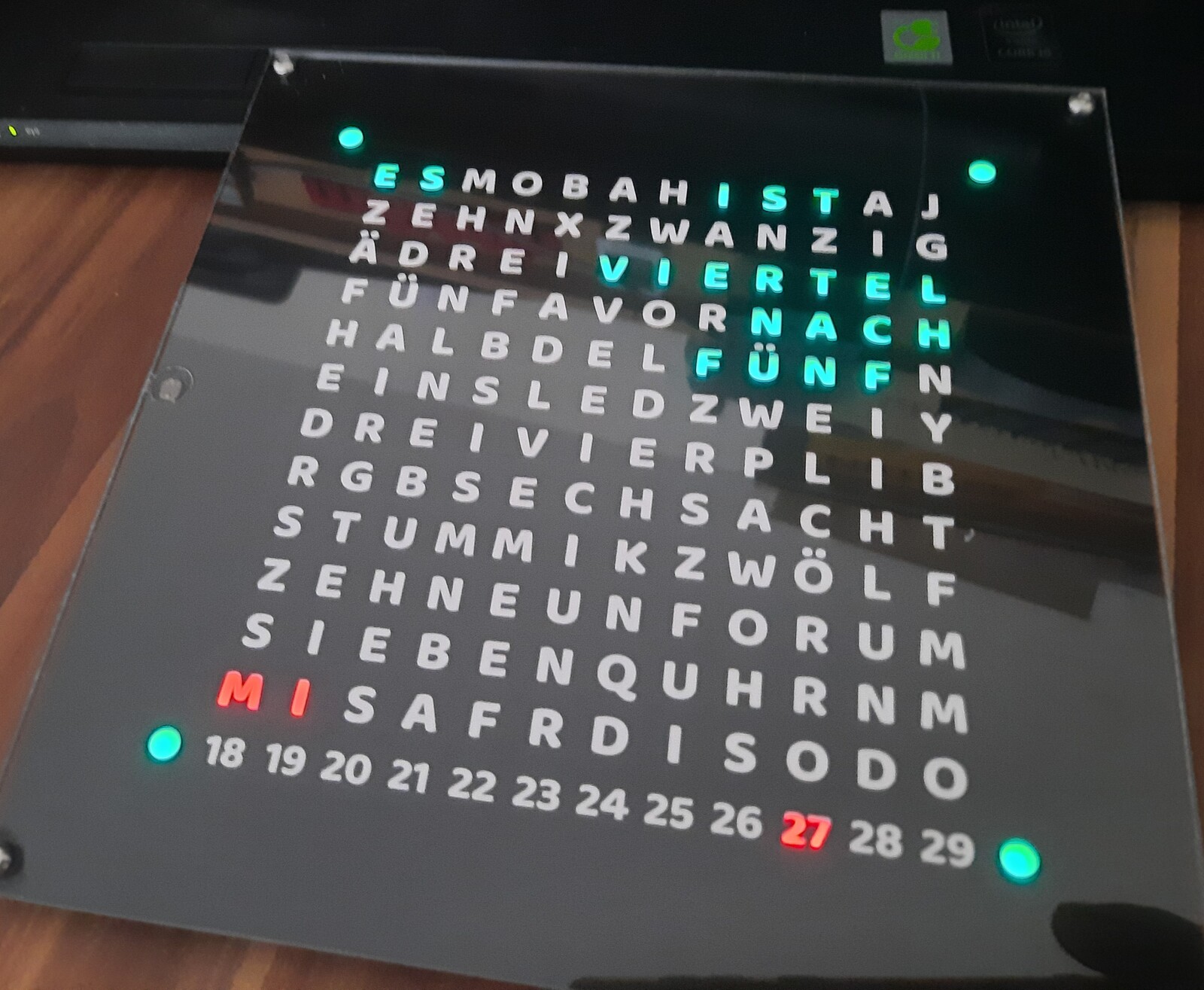 nachdem ich heute Zeit gefunden habe um meine Wordclock fertigzustellen habe ich auch die von Dir gemachte Anpassung mit ein gepflegt und was soll ich sagen funktioniert Super, hoffe man erkennt was auf den Bildern. Danke an alle beteiligten die bei dieser wundervollen Uhr mitgewirkt haben.