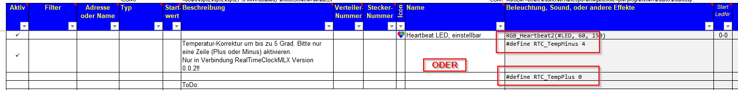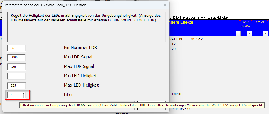Hier gab es einen Fehler, wenn der Eintrag EX.WordClock_LDR geändert werden sollte. Excel störte sich am Filterwert von "0.05". Ich hab jetzt den Wert mit 100 multipliziert. Somit wird jetzt 5 eingetragen (Minimum ist 1, Maximum ist 100) Der alte Wert ohne Änderung der Zeile wird auch akzeptiert.