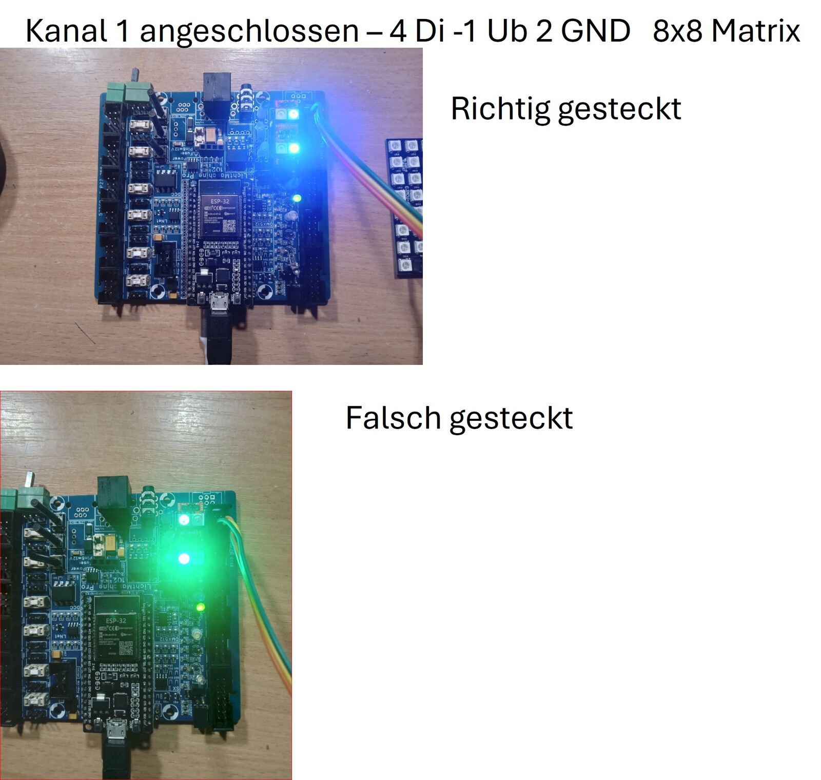 Dann würde ich auch pro Kanal zwei Heartbeats programmieren und im Wannenstecker die Pins 2 und 4 brücken. Dann sollten zumindest alle HBs blinken.