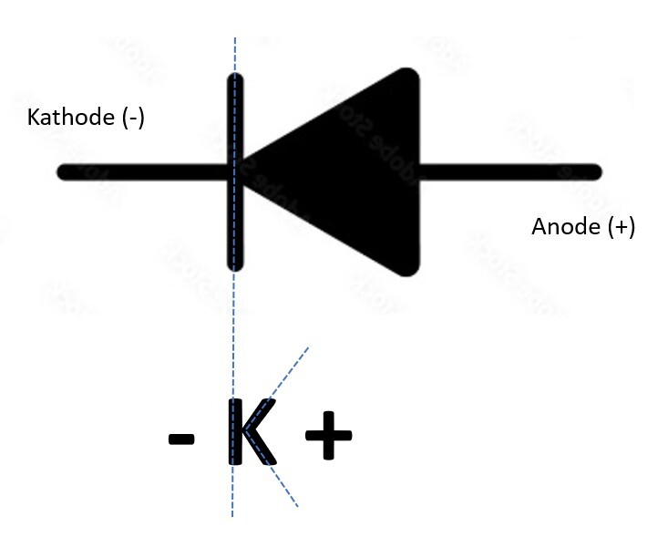 Der Buchstabe K ist ebenfalls in der Symbolik erkennbar; der senkrechte Strich, im Symbol ist der Strich des Buchstabens K und... negativ. Dieser senkrechte Strich repräsentiert auch die Linie auf der Diode selbst. Die ebene Fläche einer LED lässt sich auch auf den senkrechten Strich des Buchstabens K zurückführen und ist daher ebenfalls ein negatives (-) Zeichen.