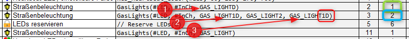 Wenn du in der zweiten Zeile ein "GAS_LIGHT3D" verwendest statt "GAS_LIGHT1D", musst du sechs LEDs reservieren.