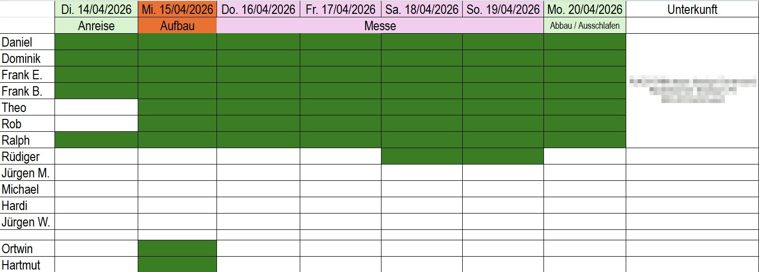 Der Aufbau unseres Standes erfolgt am 15.4.2026. Da viele von uns eine längere Anfahrt haben, langt uns die Zeit bis 17 Uhr nicht.
