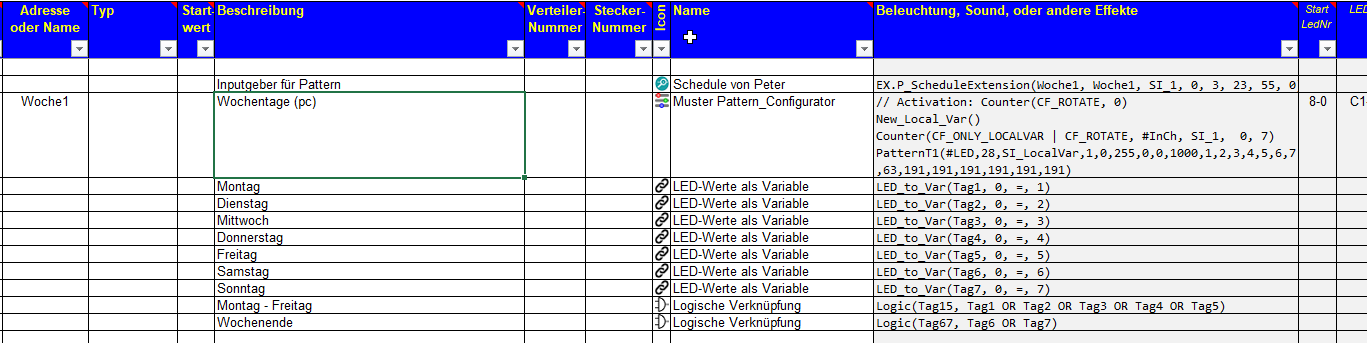 Das P_Schedule steuert das Pattern, damit das jeden Tag eins weiter schaltet (Schrittschaltwerk). Mit dem Pattern wird eine virtuelle LED (deshalb der LED-Kanal 8 , beim ESP32) von 1 bis 7 gesteuert. Über die LED_ro_Var wird dann der "Wochentag" ermittelt.