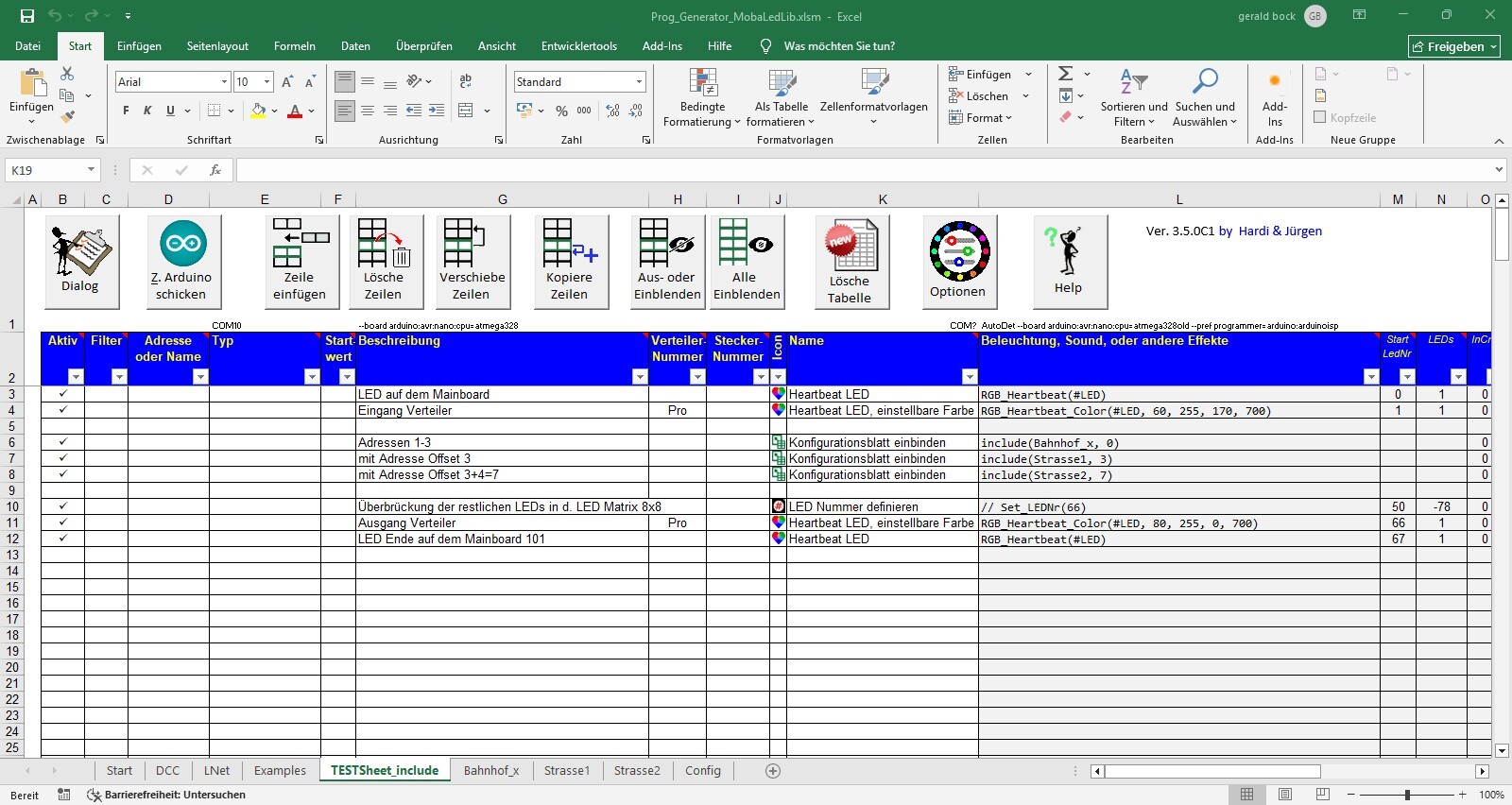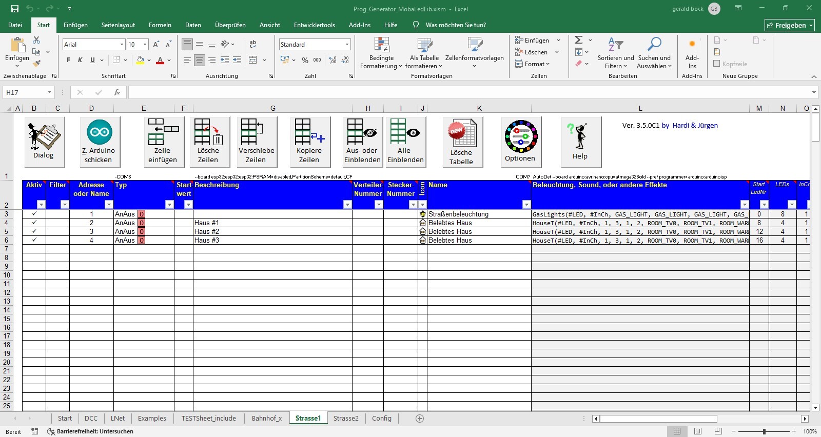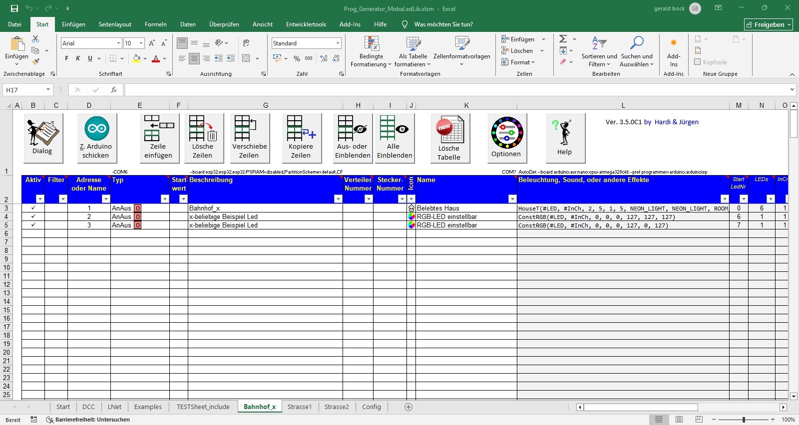 Wichtig auch: es muss nur das Hauptsheet an den Arduino übertragen werden. Die weiteren Blätter werden automatisch mit übertragen. Die Namen der Konfigurationsblätter müssen natürlich mit dem <include> übereinstimmen.