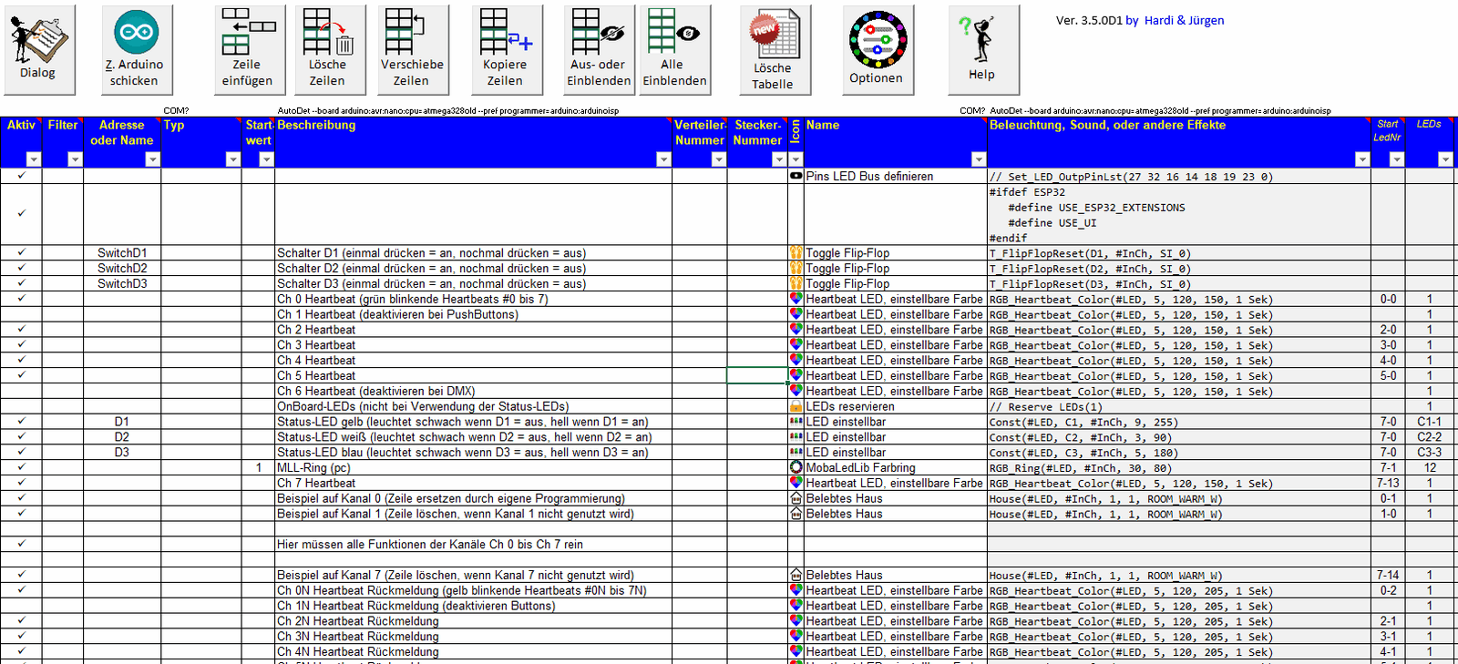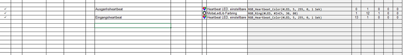 Um den Start in die ESP32-Welt so einfach wie möglich zu machen, gibt es eine fertige MLL_pgf-Datei, die die Aktivierung aller Pins, aller 16 Heartbeats, des MobaLedLib-Rings, des Displays, der drei Taster und der dazugehörigen LEDs übernimmt. Einmal importiert, kann man seine alte Programmierung einfach zwischen die Heartbeat 7 und die Heartbeat 0N kopieren. In diesem Bereich befinden sich als Beispiel drei belebte Häuser. Diese bitte löschen und die eigene Programmierung aus dem anderen Zellenblatt hierher kopieren.