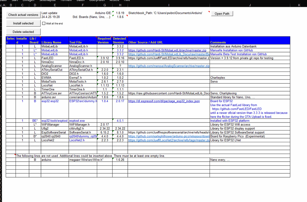 - bitte mal in der FastLED Zeile die Inhalte der Spalten mit den Einträgen 3.6.0 löschen (auch in der letzten)