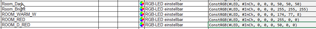 ich bedanke mich für diese Tabelle, diese hilft mir schon sehr viel weiter. Anhand dieser kann ich versuchen mir meine ROOM_WARM LED Vorstellung zu konfigurieren und dann als COL_X abspeichern.