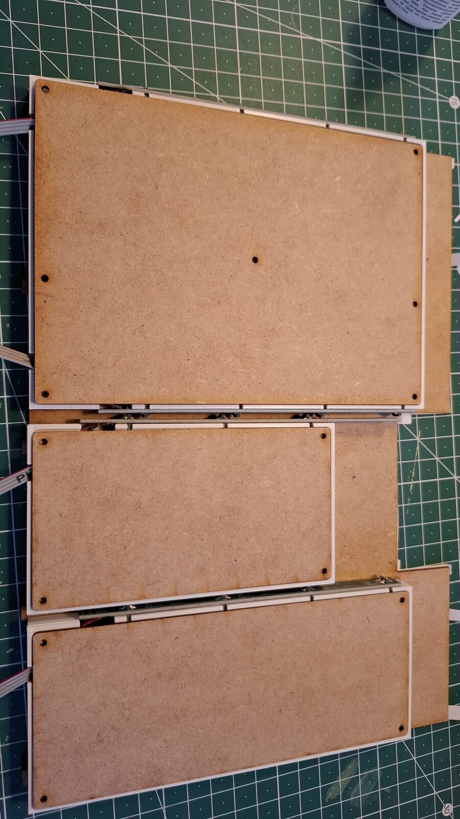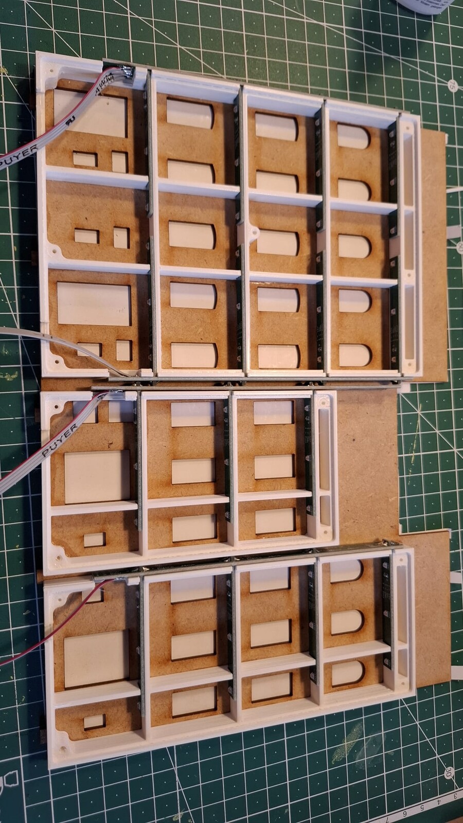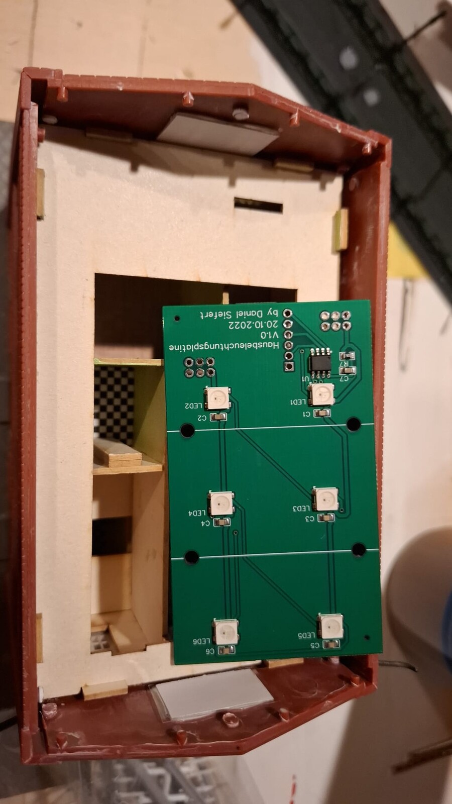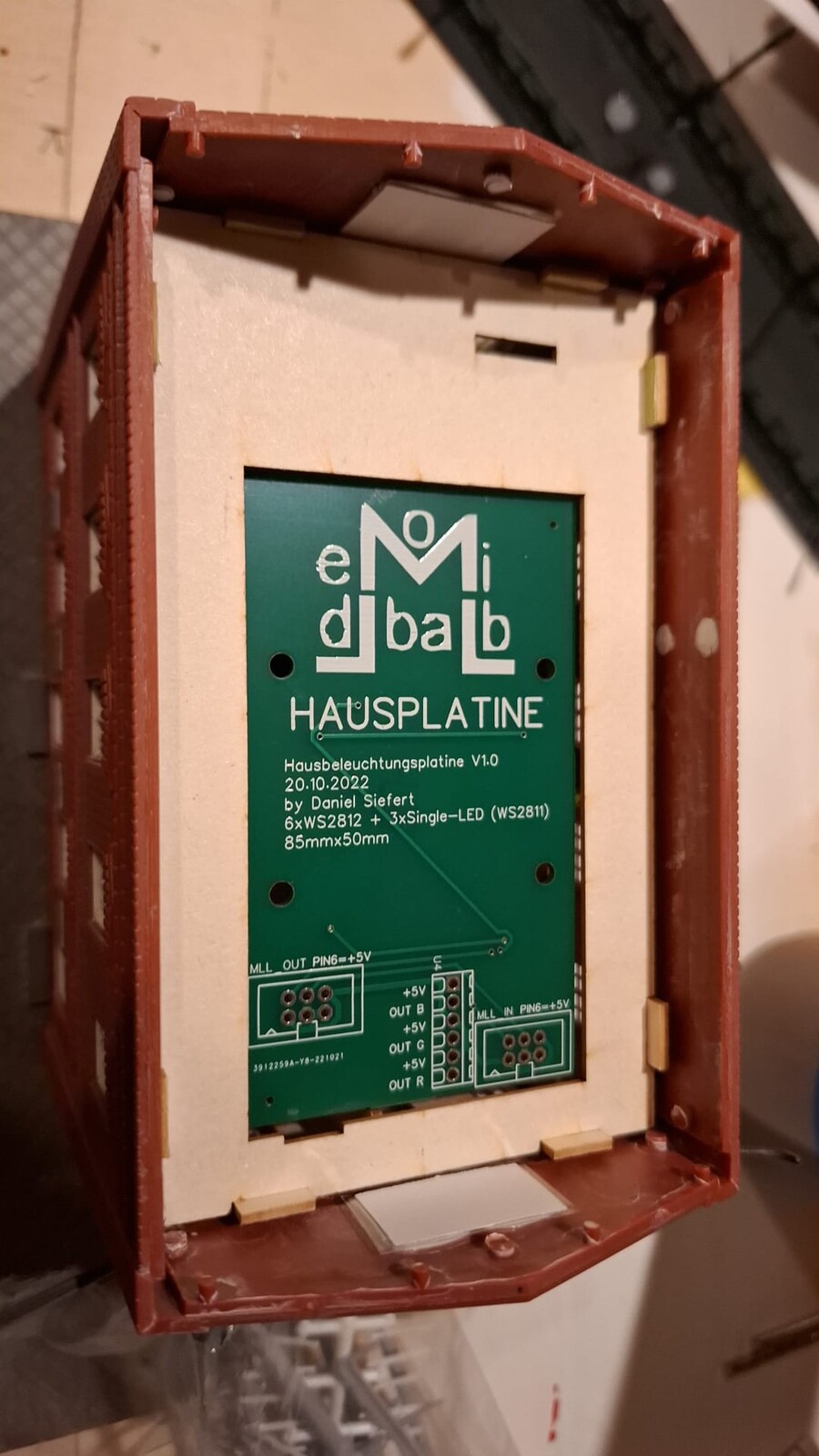 Das ist die Hintergrundzeile (zumindest die ersten drei Häuser): meine Platinen dazu sehen so aus (immer schön als 10er Pack): Die Lichtboxen seht ihr hier, sie werden auf die Fenstermaske aus MDF geklebt: Hier die ersten Beleuchtungsversuche zum Testen: Als Rückwand kommt wieder ein MDF-Deckel zum Einsatz: Alles ist verschraubt und kann jederzeit für Wartungen ausgebaut werden.