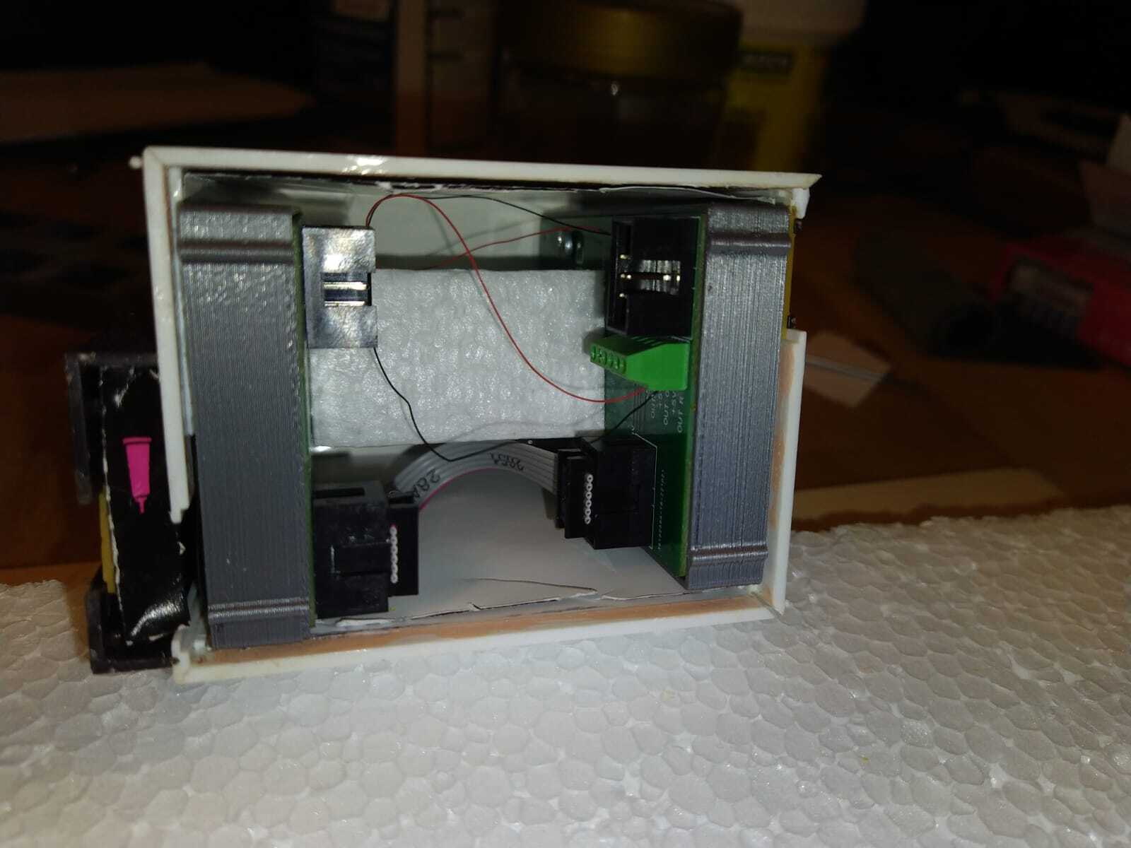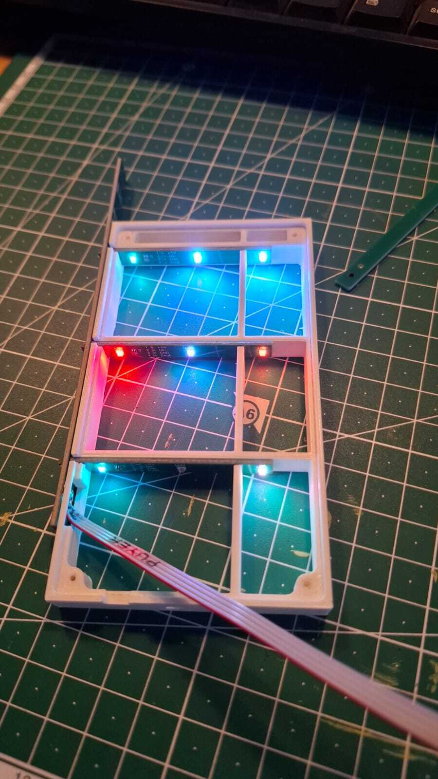 Das ist ein Inlay mit Pogo-Anschluss. 16 normale WS2812 auf 4 Etagen. Vorher hatte ich die immer mit Außenwänden gebaut, war mir hier zu fummelig. Es geht auch so.