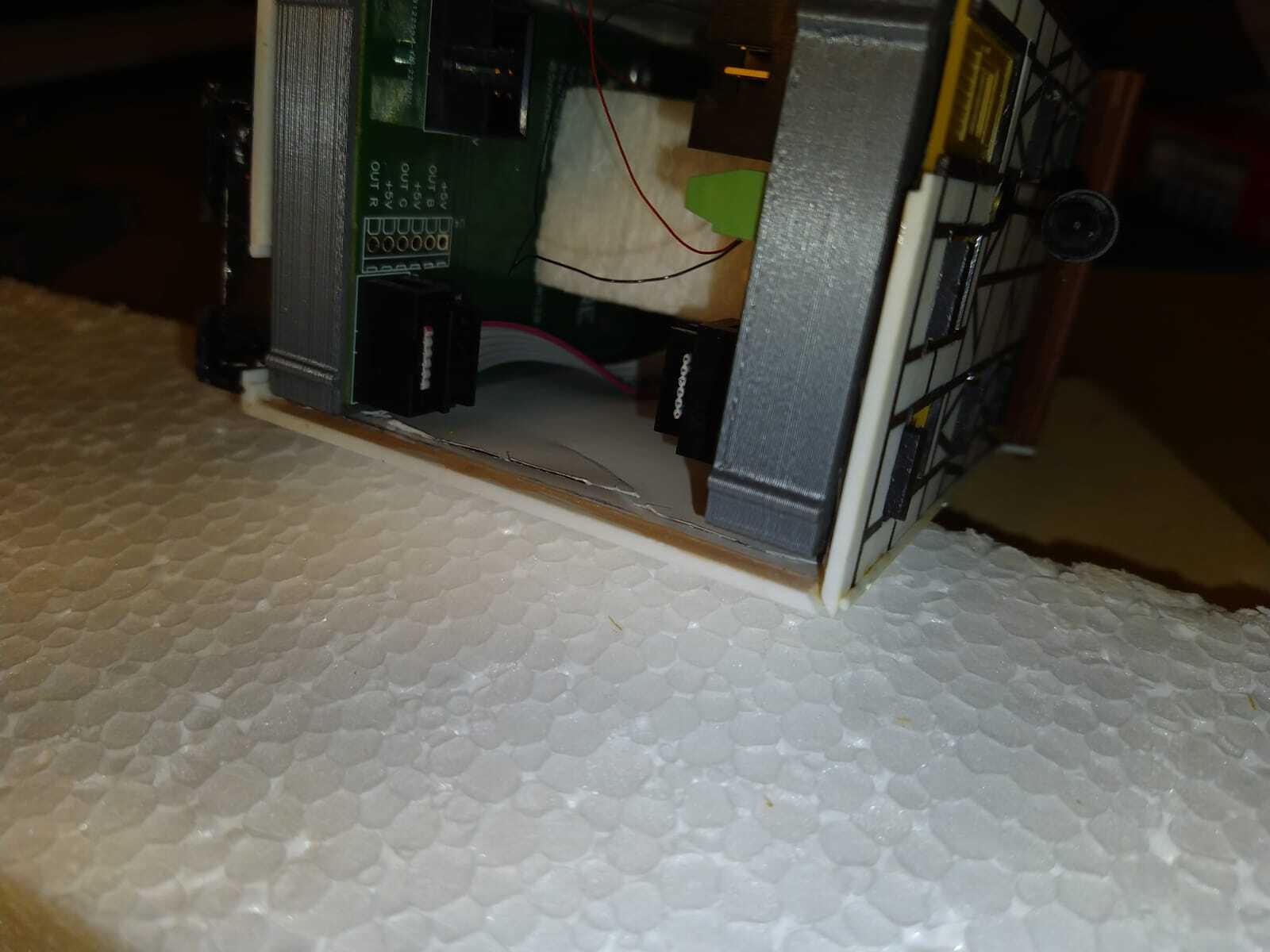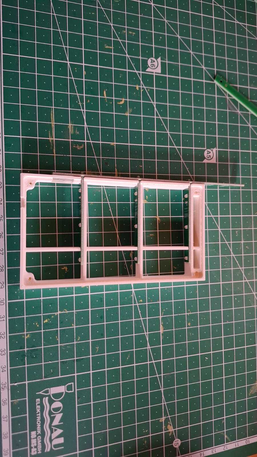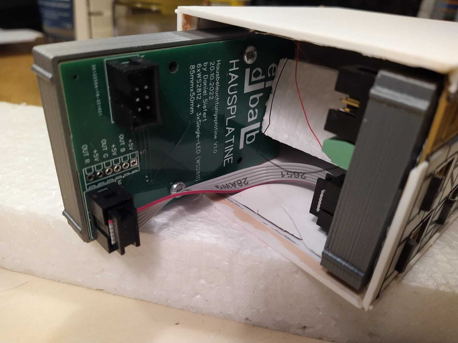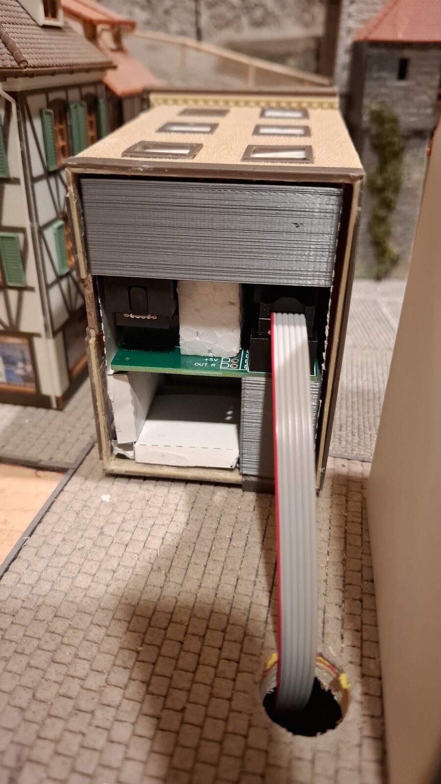 So ähnlich hatte ich es mir bei meiner Eingangsfrage gedacht. Da meine Häuser keine Dachfenster haben, wäre es rechteckig geblieben. Vielleicht in einem Stück wie ein Setzkasten mit Öffnungen an den Außenteilen zwischen den Etagen für die Flachkabel.
