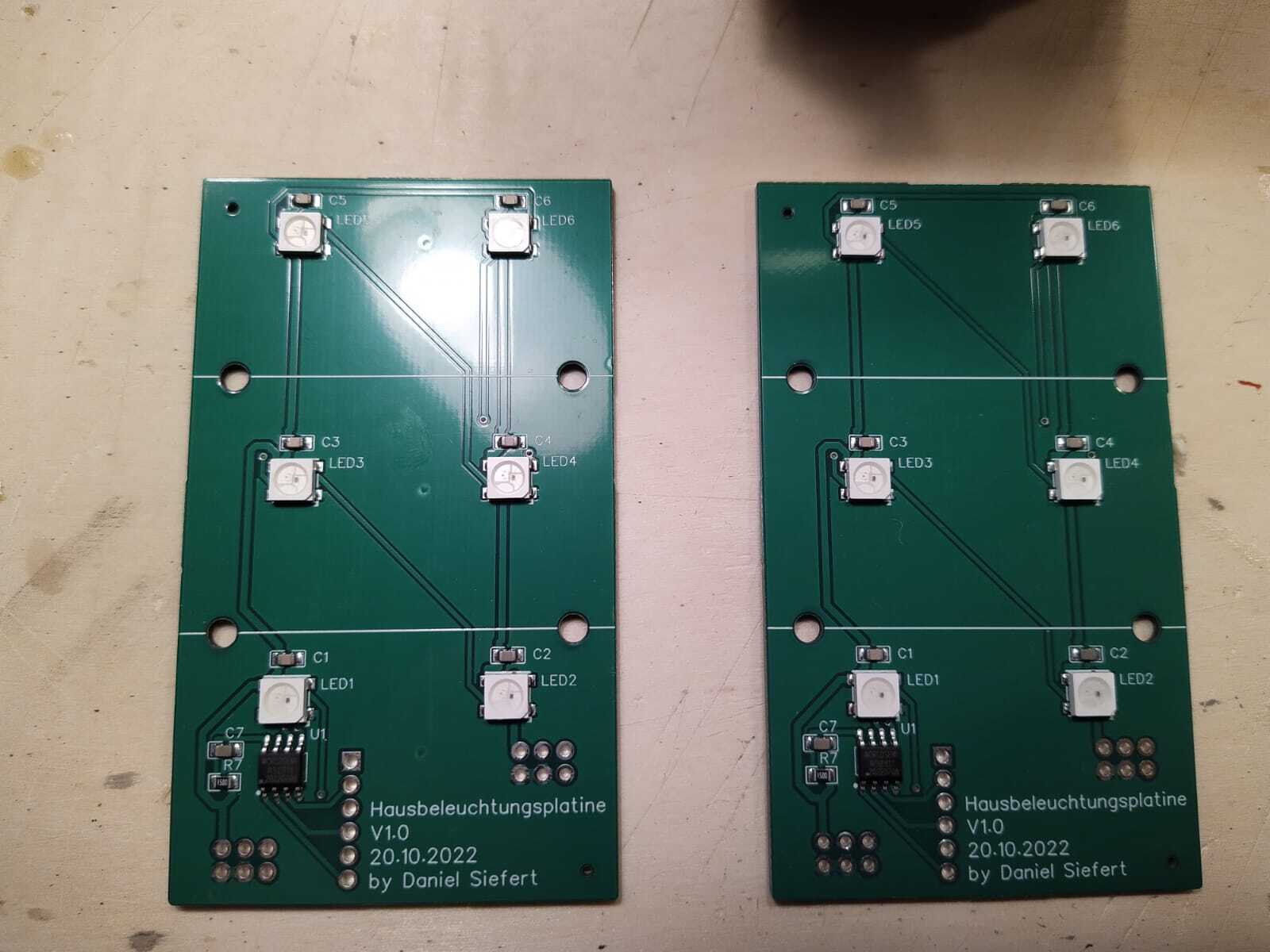 Auch hierfür habe ich mir eine Platine erstellt: sie hat 6x einen WS2812 an Board und einen WS2811, um z.B. Außenlaternen anzuschließen.