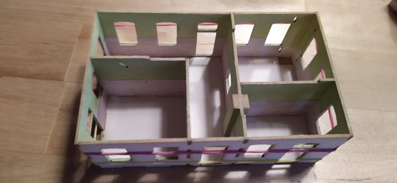 eine weitere Möglichkeit für Gebäudebeleuchtung ist eine Innenraumaufteilung herzustellen. Hier kann man schön Architekt spielen. Mit Finnpappe und Lasercutter entstehen die Wände, mit Farbe und Farbausdrucken entsteht die Innenraumgestaltung.