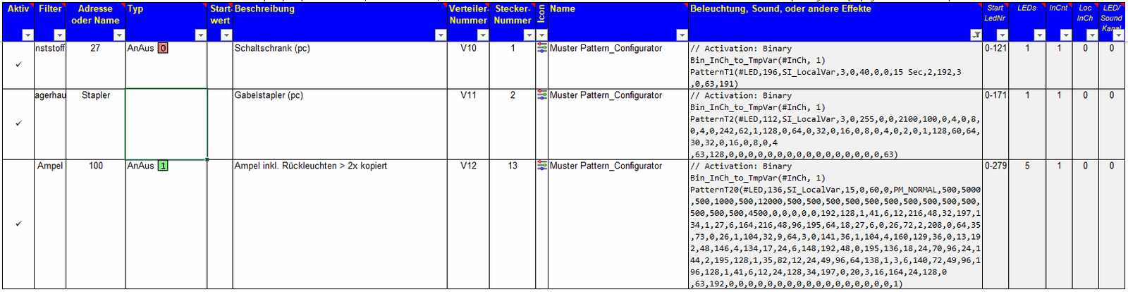 Es ist noch etwas spezifischer!raily74 hat geschrieben: Mi 18. Feb 2026, 13:52Zeile 1 (DCC #27) und 3 (DCC #100) zählen zu solchen Fällen, bei denen die verwendete DCC-Adresse nicht ausschließlich für das Pattern verwendet wird, sondern bereits einige Zeilen drüber andere Funktionen schaltet. Daher funktionieren diese beiden Pattern mit der 3.5.0D4-long NICHT.