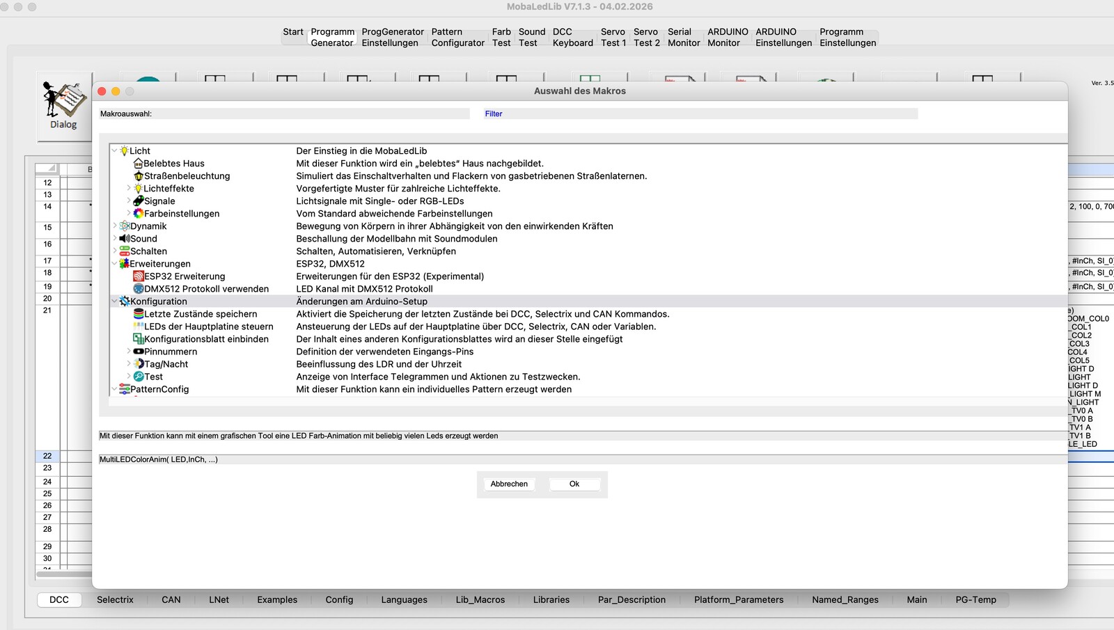 - Makro-Extensions: Mit dem pyMLL spezifischen Makro MultiLED Farb-Animation lassen sich beliebige Pattern mit beliebig vielen LEDs erzeugen. Testweise gibt es in diesem Makro jetzt einen Button: Eigener Makro, und oben im Fenster neue Felder für einen Name und eine Kurzbeschreibung des Makros. Ein Druck auf den Button erzeugt eine neue MLL-Makro-Extension mit den Eigenschaften des Patterns, das man in der MultiLED Farb-Animation erstellt hat. Dieser Makro kann direkt in der Makroliste unter "Erweiterungen" ausgewählt werden. Als einzigen Parameter kann man die Zeit für den ersten Zeitparameter des Patterns einstellen. Der Makro funktioniert übrigen nicht nur in der pyMLL, sondern auch im ExcelprogrammGenerator.
