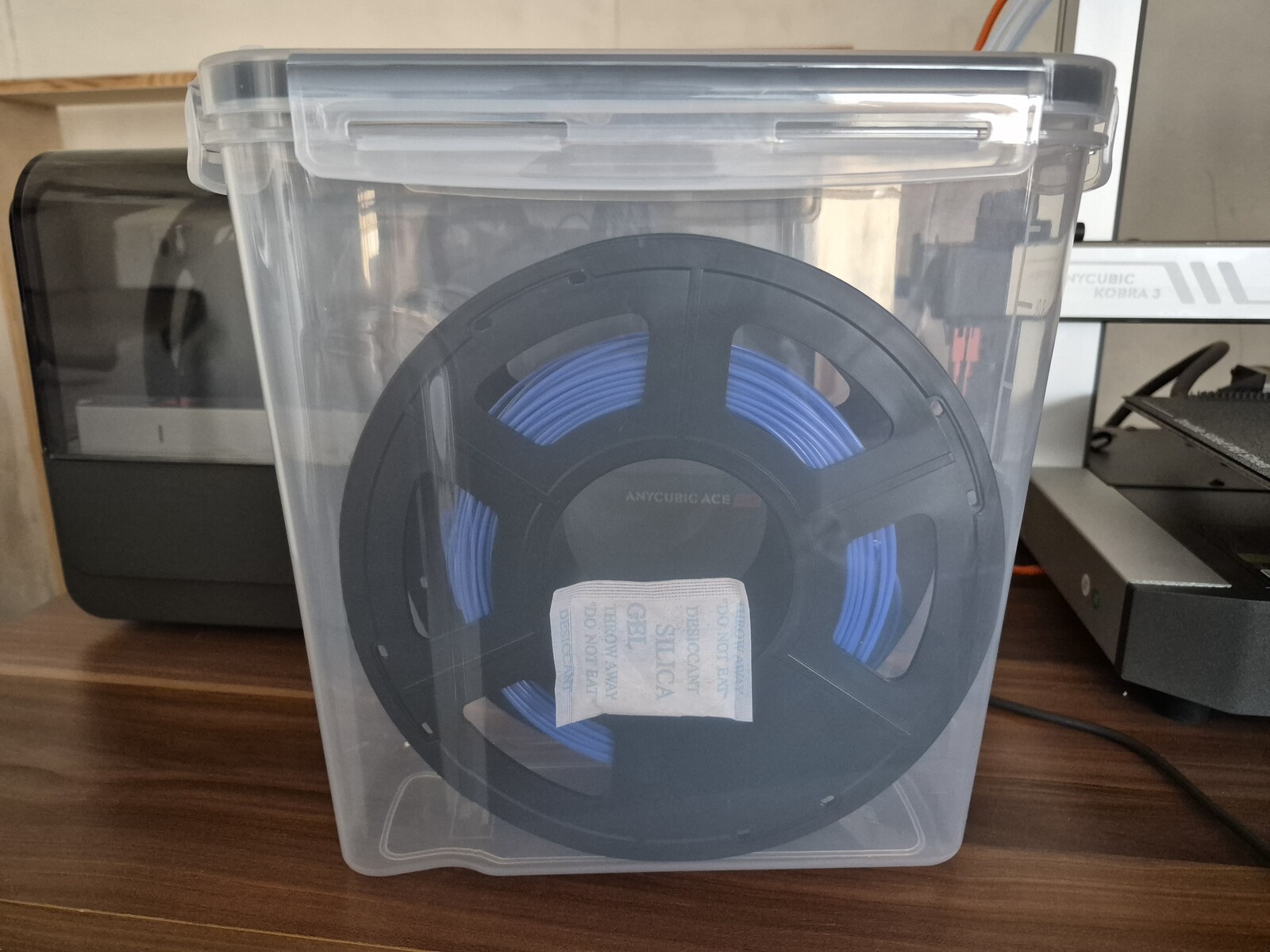 Wichtig ist natürlich auch die Lagerrung des Filaments wenn es nicht in Verwendung ist. Dafür verwende ich Müslidosen vom großen "A" Versandhaus mit Trockenbeutel drin.
