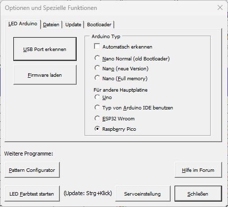 Wenn du die neueste Version geladen hast, musst du in den Optionen noch den USB Anschluss mit dem Pico auswählen. Anschließend kannst du deine Konfiguration in den Pico laden.