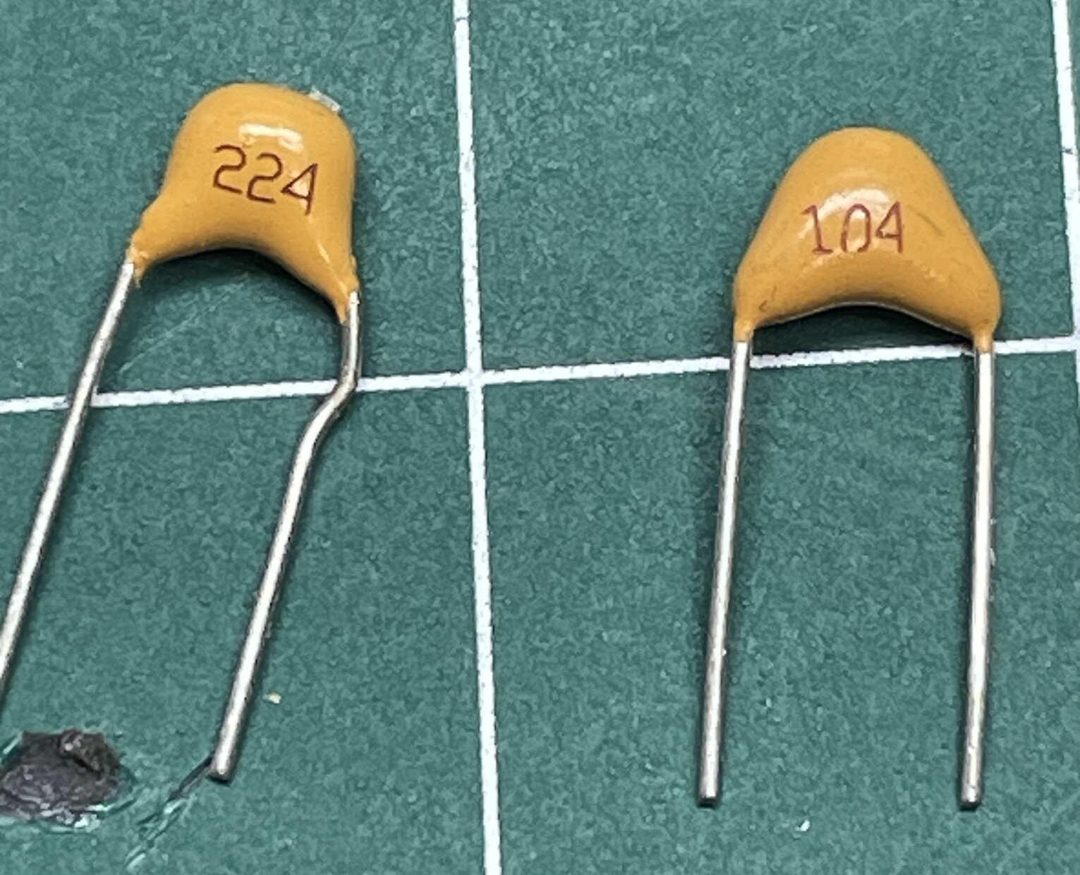 Hilfreiche Erläuterung der Bedeutungen/Kennzeichnungen auf den Kondensatoren. Der Wert 104 bedeutet 10 gefolgt von vier Nullen. Also 104 = 100.000 pF = 100 nF. Analog dazu: 224 = 220.000 pF = 220 nF. Dieser Vielschicht-Keramikkondensator Type hat üblicherweise eine Toleranz von 20 %. Bei einem Wert von 220 kann dieser daher zwischen 176 und 264 liegen.