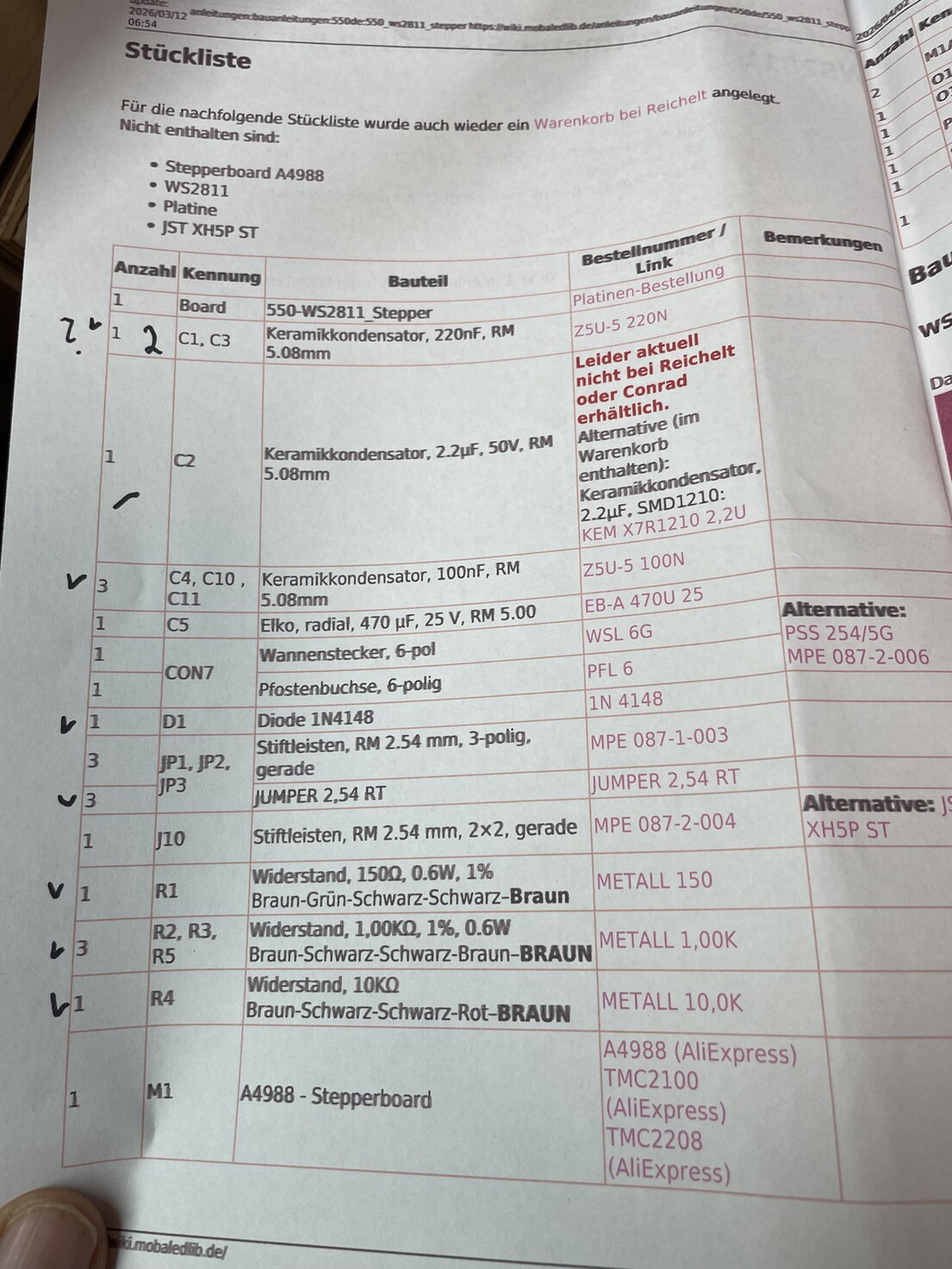Trotzdem ist mir noch die Abweichung der Anzahl der Kondensatoren zwischen Bauanleitung im Wiki und der Teileliste unklar.