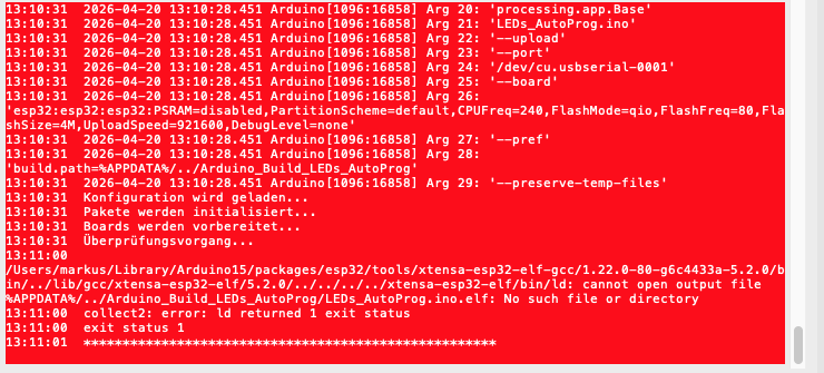 Ich habe die Einstellung vorgenommen, aber ansonsten tritt keine Änderung ein. Die blaue kleine LED auf dem ESP-Board zeigt, dass der USB-Port wohl erkannt wird. Wie kann ich sehen, ob die Lichtmaschine funktioniert? Müsste das Display nicht etwas anzeigen oder LED-Ring leuchten?