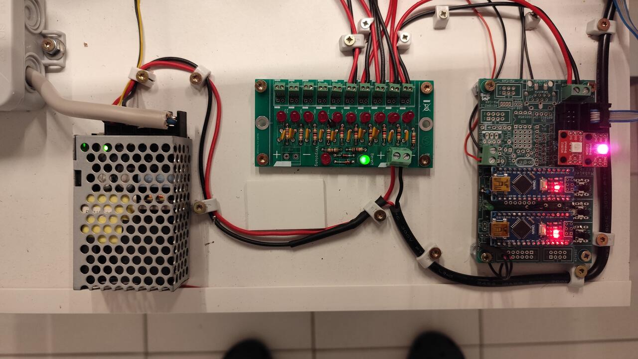 Von meinem Netzteil (Output 3.0 A bei 5V) aus, habe ich über eine Sicherheitsplatine, bei dem jeder Kanal mit 1 Ampere abgesichert ist, vier 10er Verteiler und die Hauptplatine mit Strom versorgt. Es hängen an den vier 10er Verteilern 100 RGB LEDs und die 8er Relaisplatine. Eventuell könnte der dritte Verteiler an seine Grenze kommen,