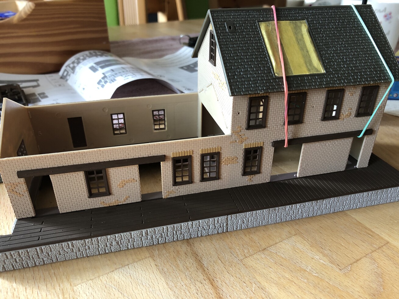 Häuser, die ich neu baue, werden generell mit losem Dach gebaut. Damit das Dach dann trotzdem satt aufliegt, werden die einzelnen Dachteile untereinander verklebt und dürfen in dieser Position über Nacht durchtrocknen. Wenn es am nächsten Tag durchgetrocknet ist, wird es im Giebel zusätzlich mit Stabilit Express verstärkt. Wenn es trotz dieser Vorgehensweise nicht satt aufliegt, bekommt es vier Neodym-Magnete und vier Muttern als Gegenstück im Gebäude oder umgekehrt.