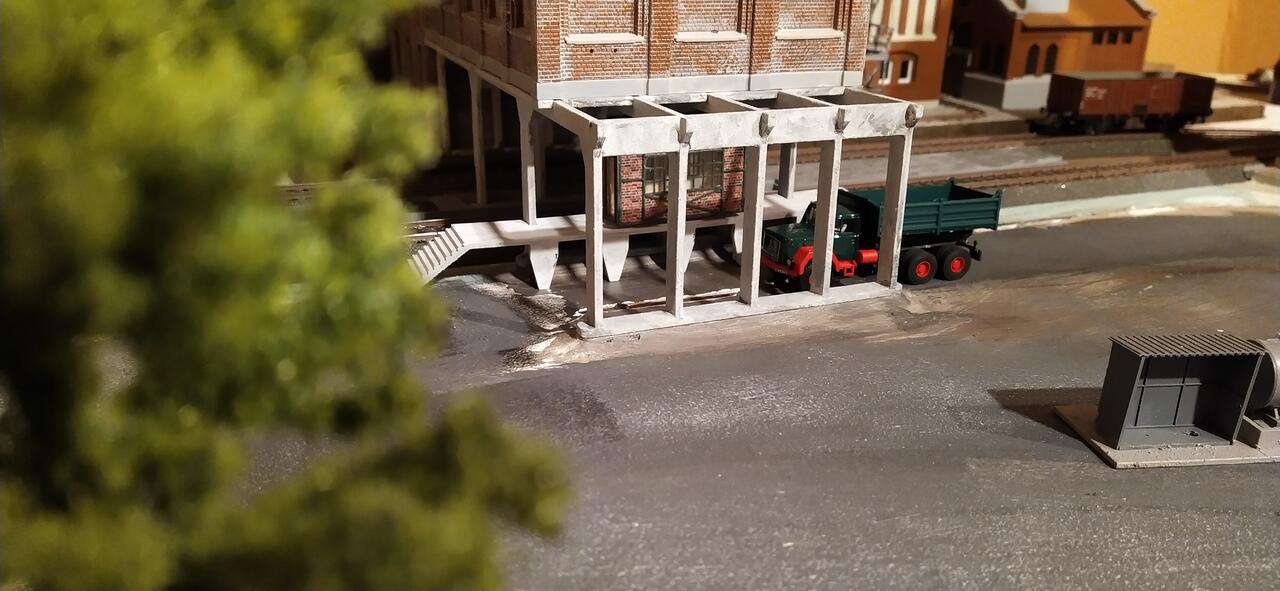 Die Verladung ist weiterhin noch für eine LKW-Verladung ausgelegt. Hier schaltet der ankommende LKW automatisch den Verladesound über einen Reed-Kontakt an. Da es die Viessmann-Reed-Kontakte noch nicht gibt und meine noch nicht zuverlässig erkannt werden, ist das noch im Bau. Hier schon ein kleiner Einblick: