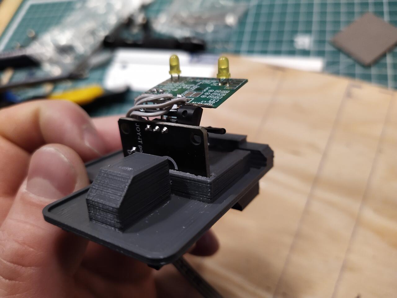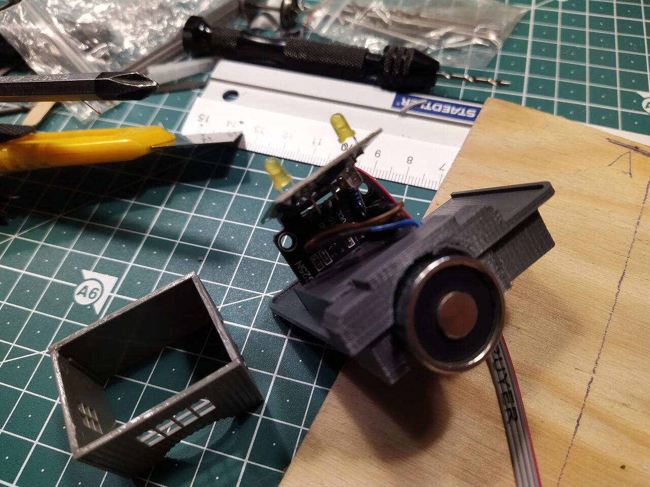 Da auf der Magnetplatine zum ansteuern des Magnets ein NPN-Transistor ist, und man somit einen positiven Signaleingang (+5V) hat, musste ich noch einen PNP-Transistor dazwischenschalten. Man sieht ihn zwischen den beiden Platinen liegend eingelötet.