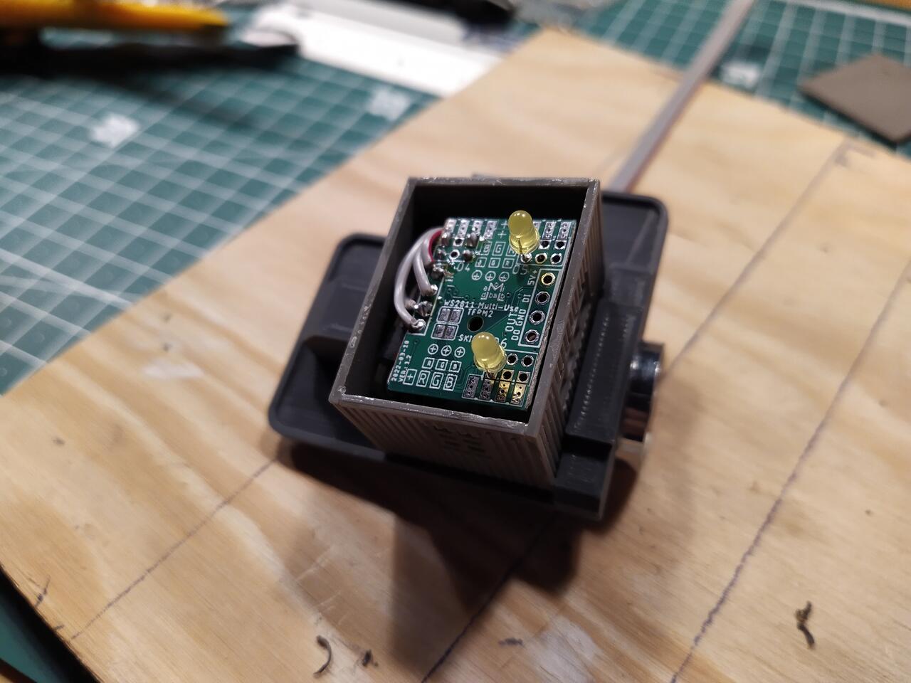 Die Multi-Use Platine hat sich hervorragend geeignet, da ich sie im Winkel des Daches an die Magnetplatine anlöten könnte. Die Ausgänge der Platine haben auch perfekte Positionen zum Anschluss der Blinklichter. Insgesamt habe ich den Magneten, eine Kabinenbeleuchtung und zwei Warnblinklichter angeschlossen. Fünf Kanäle sind noch für Erwieterung verfügbar (z.B. Rundumleuchten mit je drei LEDs)