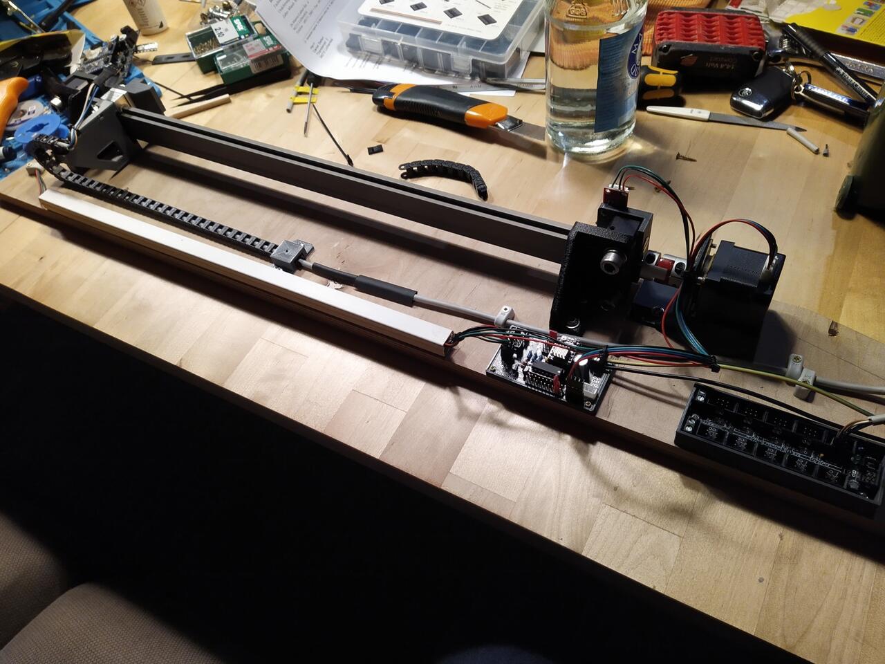 Die Linearführung befindet sich unter der Anlage, hier ein Bild vom Aufbau auf dem Schreibtisch: