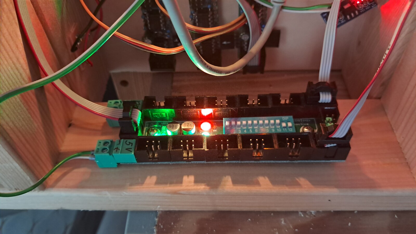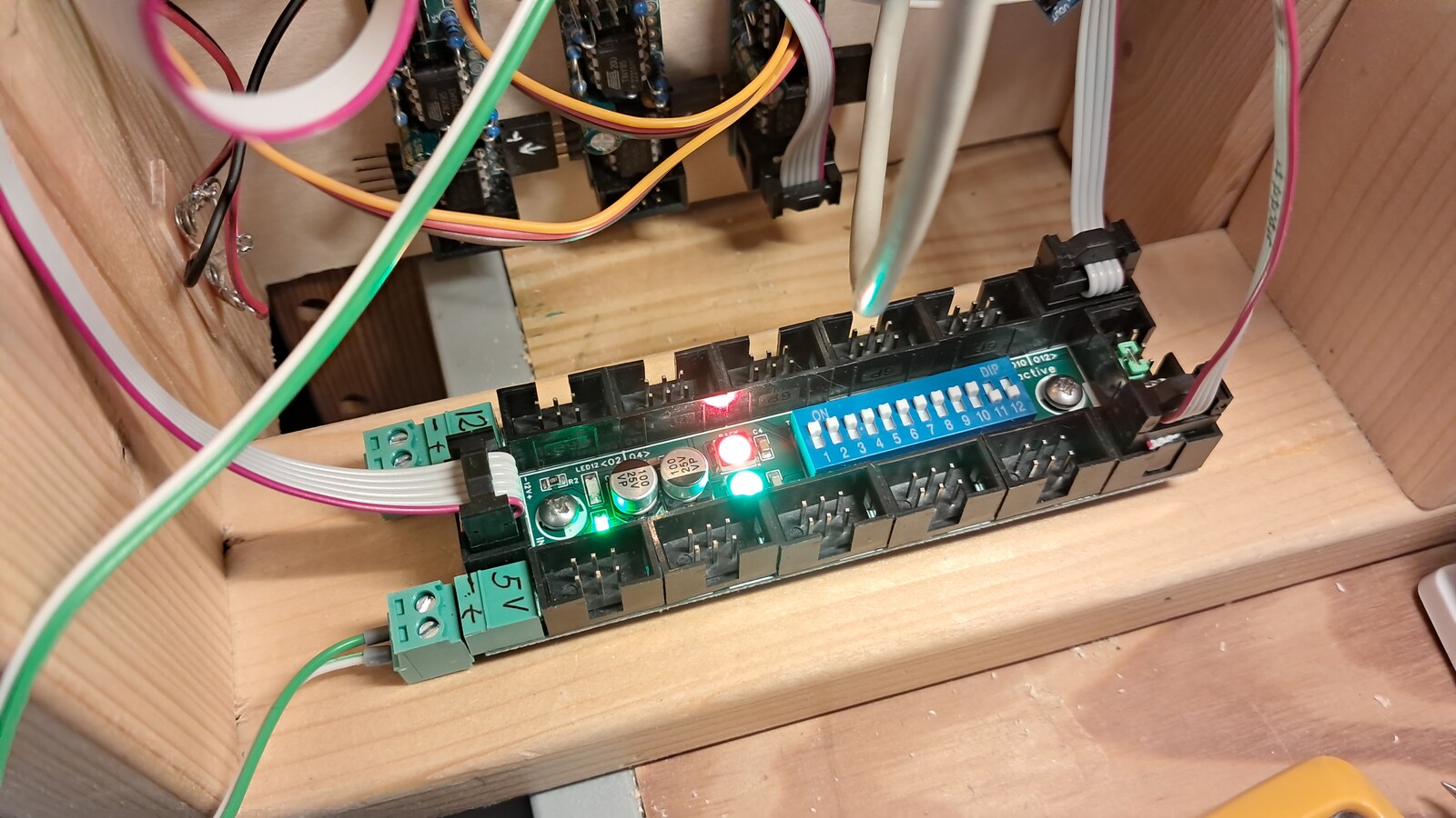An dem Verteiler hängen im Moment WS2812 und Extender, außerdem eine 8x8Matrix an den letzten beiden Anschlüssen.
