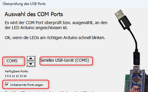 - den COM-Port das Nano mit den "Pfeil rauf/runter" Buttons auswählen