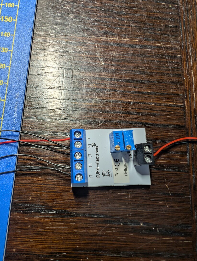 Ich habe mir auf einer Modellbahnbörse vor einer Woche eine Lauflichtsteuerung und 2 passende Lauflichter gekauft. Bilder sind im Anhang. Leider ist die Taktfrequenz und die Helligkeit nicht einstellbar an den beiden Potis. So blinken die LED Lauflichter viel zu schnell. Leider antwortet der Hersteller in Remscheid nicht mehr auf E- Mails. Scheint ihn nicht zu interessieren das seine Ware defekt ist. Wer weis hier was falsch ist oder was ich machen kann. Der Händler ist auf jeden Fall nicht zu empfehlen. Die Homepage ist auch nicht erreichbar. Ganz toll was die machen.