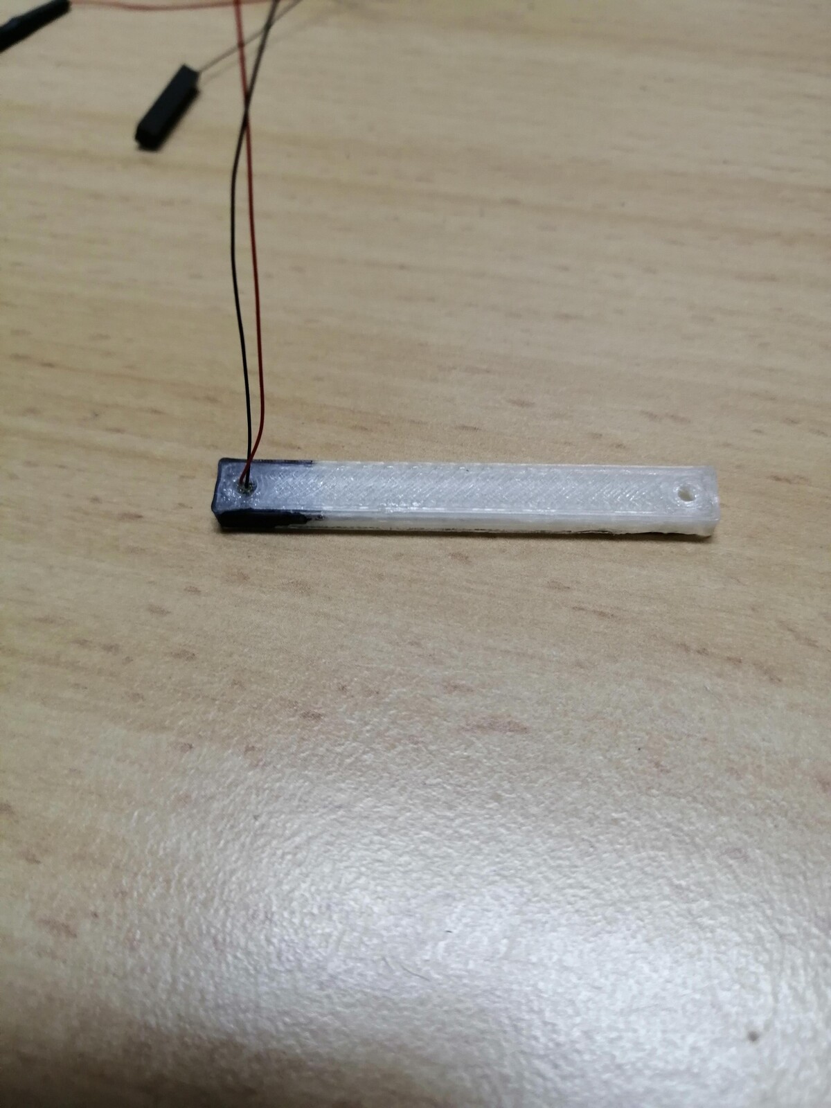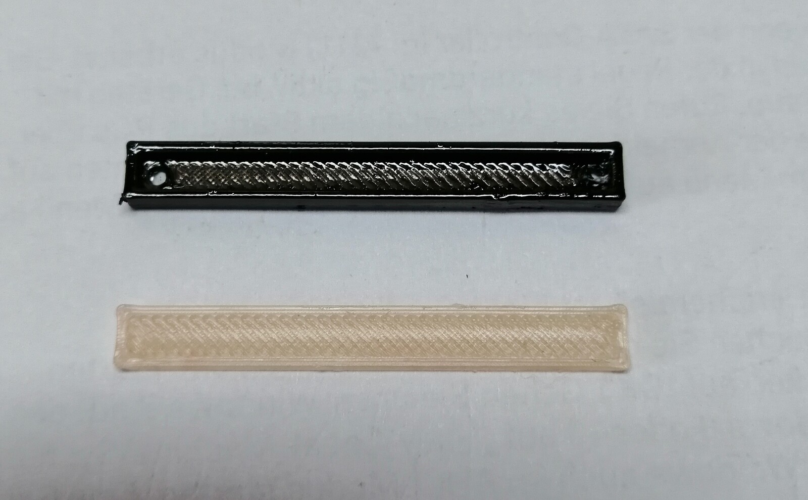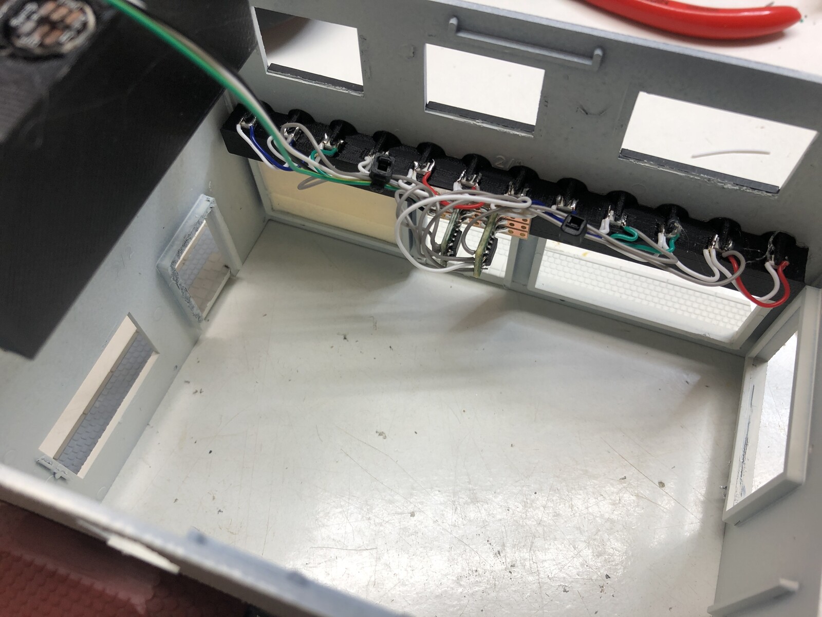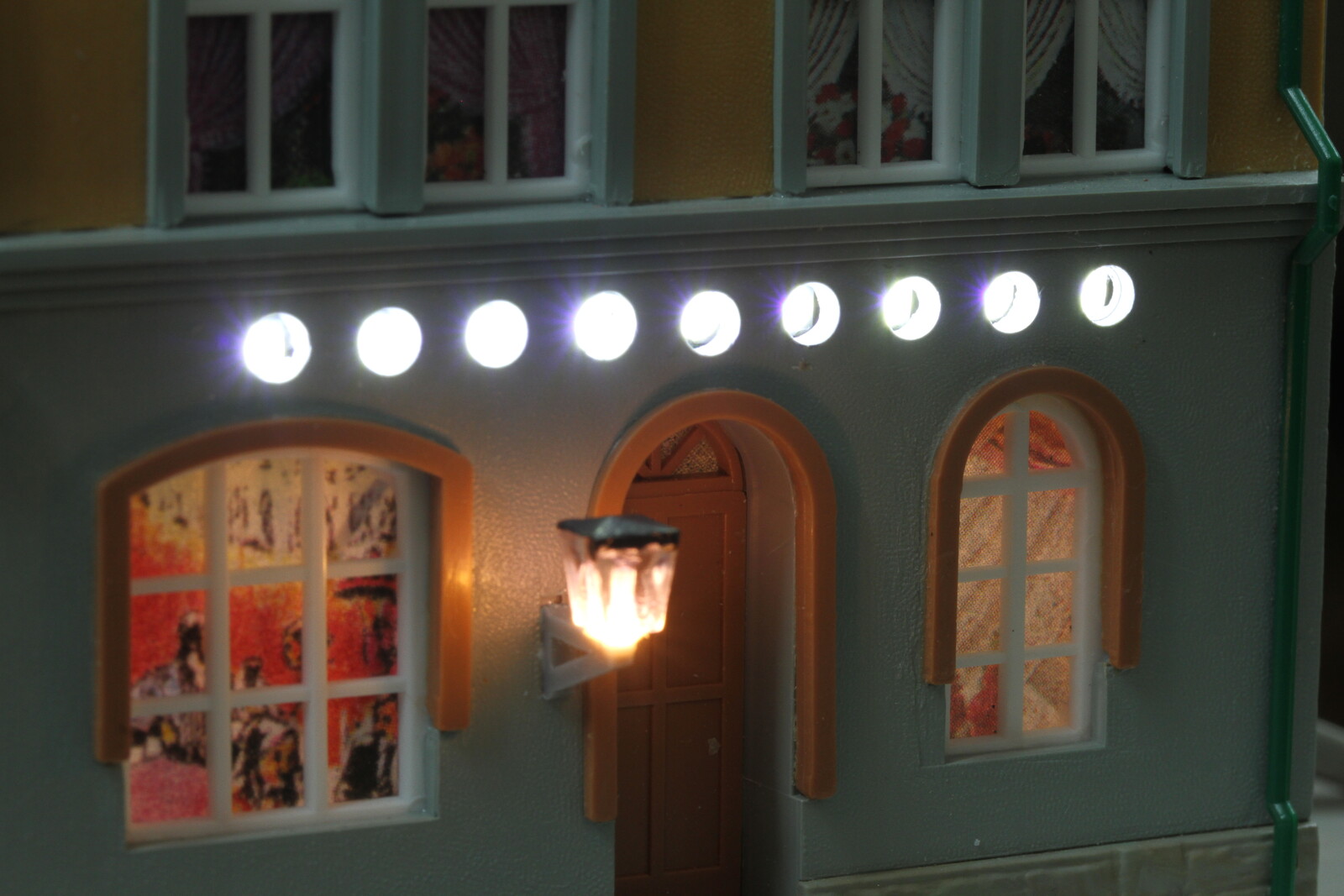 Letztendlich geht es rein um die Lichtverteilung und die wirst du mit zwei LEDs auf 53 mm Länge nicht sauber hinkriegen, zumindest nicht mit transparentem FDM-3D-Druck. Da hab ich auch alles versucht von 15% Infill über verschiedene Infill-Muster bis hin zu Vollmaterial. Auch die Erhöhung auf drei oder vier LEDs auf die Länge wird man sehen können. Beim Gasthof sieht man bereits die neun einzelnen LEDs auf 54 mm Länge (bei nur 6 mm Abstand). Was auf meinem Foto ziemlich gleichmäßig wirkt, ist in Natura sehr ungleichmäßig, und das, obwohl ich inzwischen sogar die Stege zwischen den Bohrungen rausgesägt habe. Der Abstand zwischen LED und Leuchtkörper ist für eine gleichmäßige Verteilung einfach zu klein.
