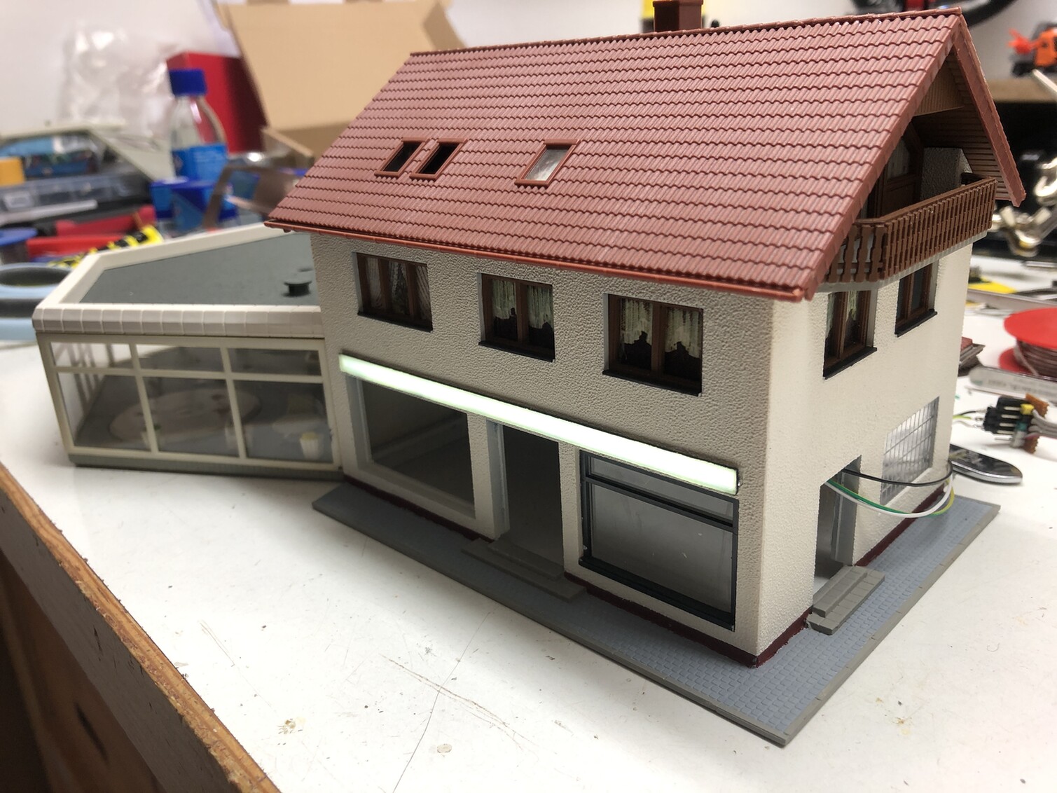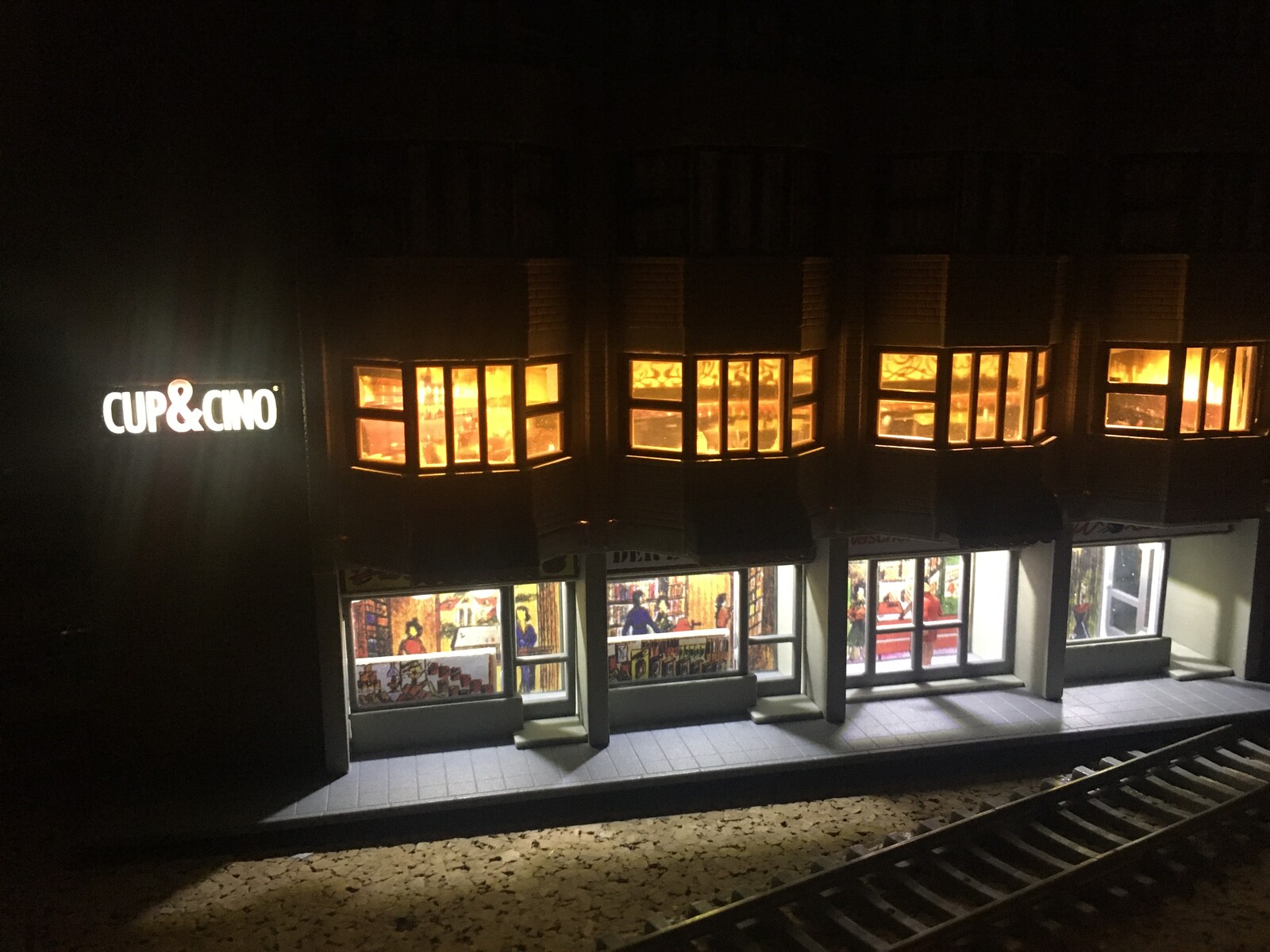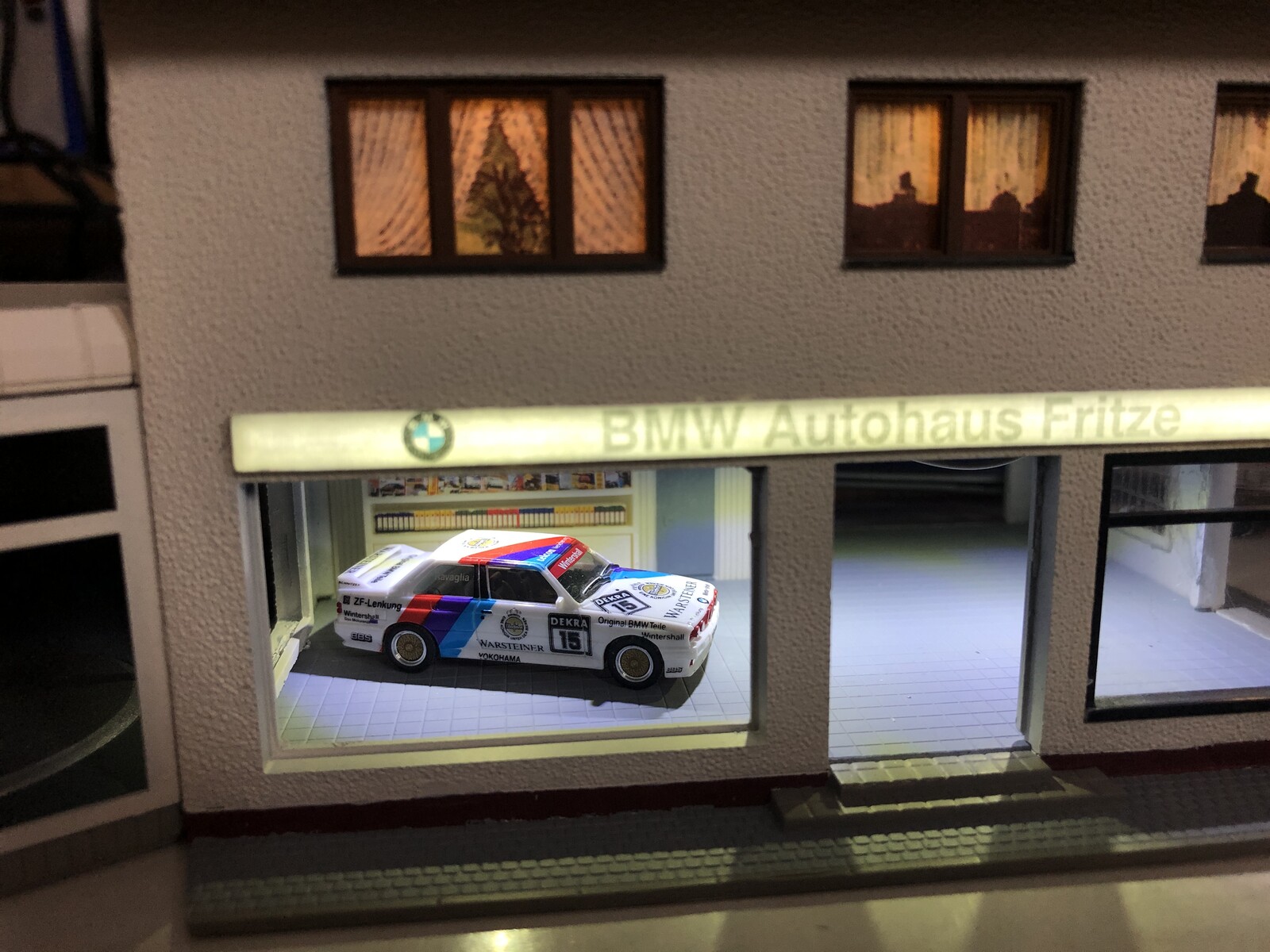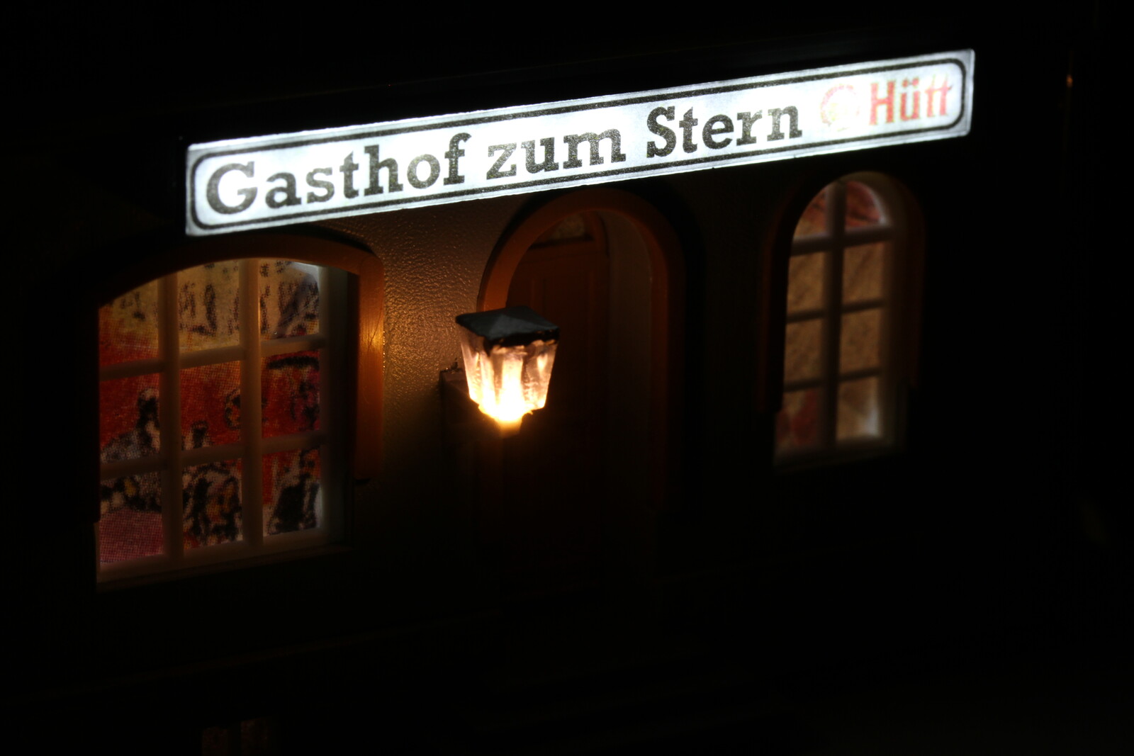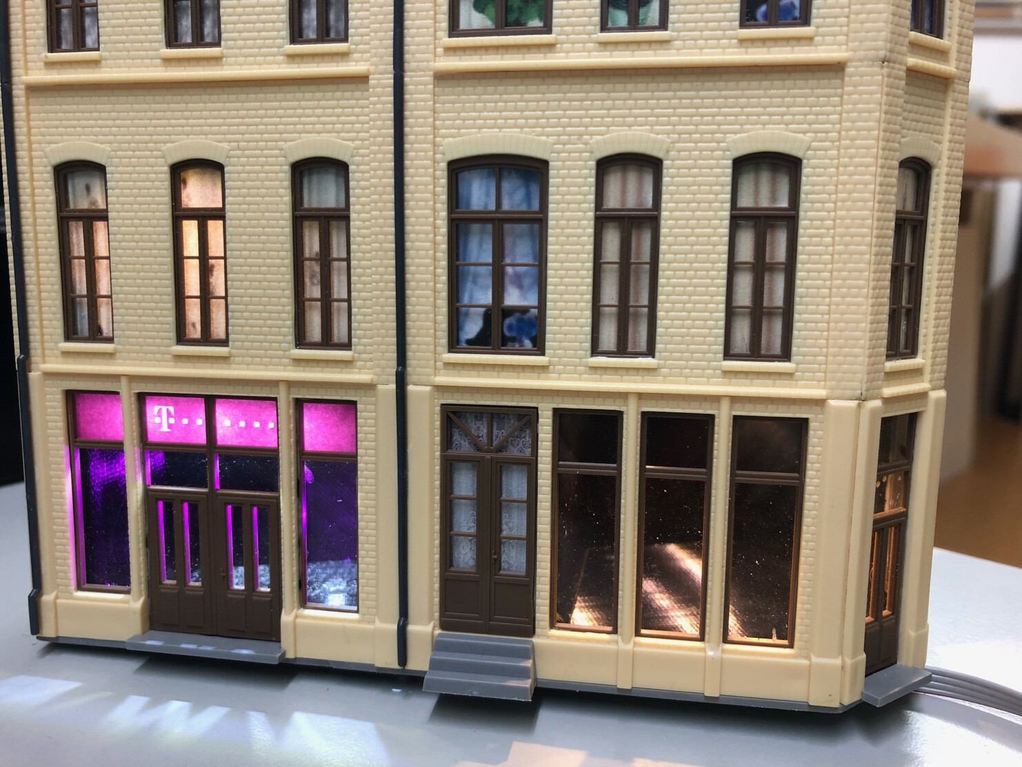 Fun-Fact am Rande: Genau dieses Gebäude ist der Verursacher der "Aluband-Methode". Bei dem Zimmer über dem rechten Ladengeschäft war das Fenster über Eck aufgrund der Konstruktion der Lichtbox viel dunkler als die linken beiden Fenster. Das hat mich tierisch gewurmt, sodass ich erst mit weißem Lack experimentierte. Doch das war letztendlich zu zeitaufwändig, weshalb mir als nächstes das selbstklebende Aluband einfiel. Dieses Verfahren verwende ich seit diesem Tag in jeder Lichtbox!