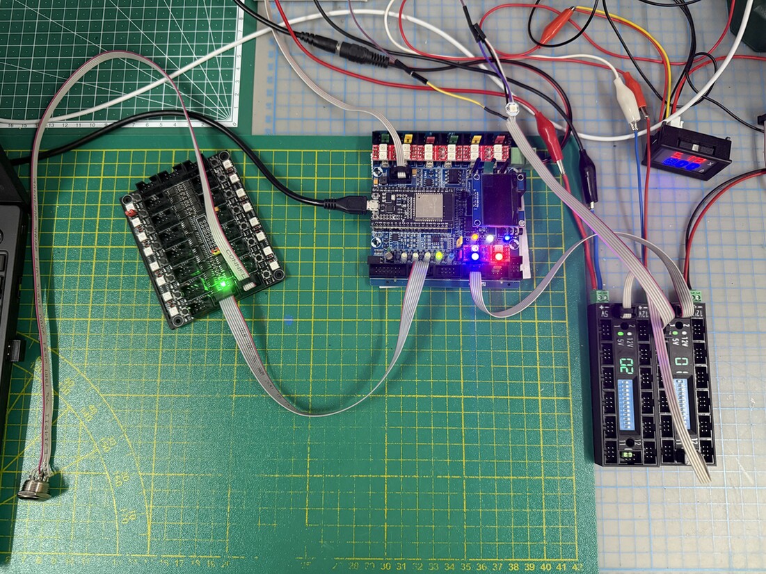 Aktuell ist es so, dass der Taster als Taster funktioniert. (Solange ich den 16 mm Taster oder den Taster auf der Push Button Platine drücke leuchtet zum Beispiel eine LED welche über einen Verteiler am Kanal 0 der Lichtmaschine angeschlossen ist.)
