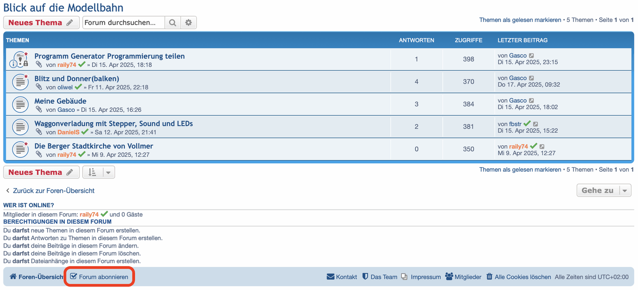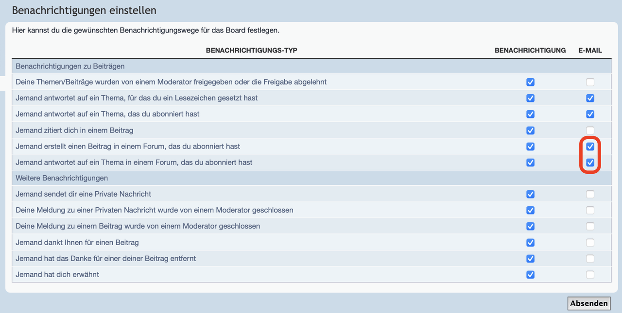 ganz wichtig in dem Zusammenhang ist noch das Abonnieren der gewünschten Foren. Das Häkchen befindet sich jeweils in der untersten Foren-Ebene am unteren Seitenrand und kann für jedes einzelne Unterforum aktiviert werden.