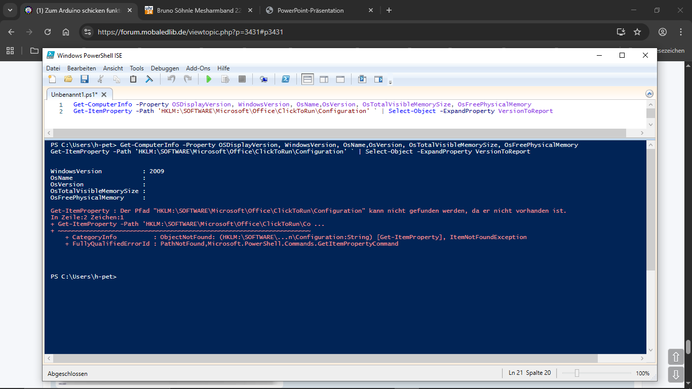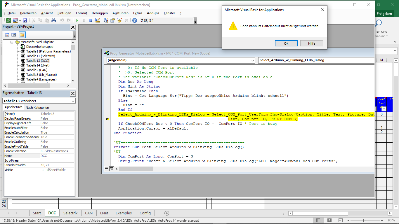 Ich wollte meine Excel-Datei zum Arduino schicken. Das brachte folgende Fehlermeldung "Visual Basic - Automatisierungsfehler". Der Klick auf Debuggen brachte u.a. den Hinweis "Code kann im Haltemodus nicht ausgeführt werden".