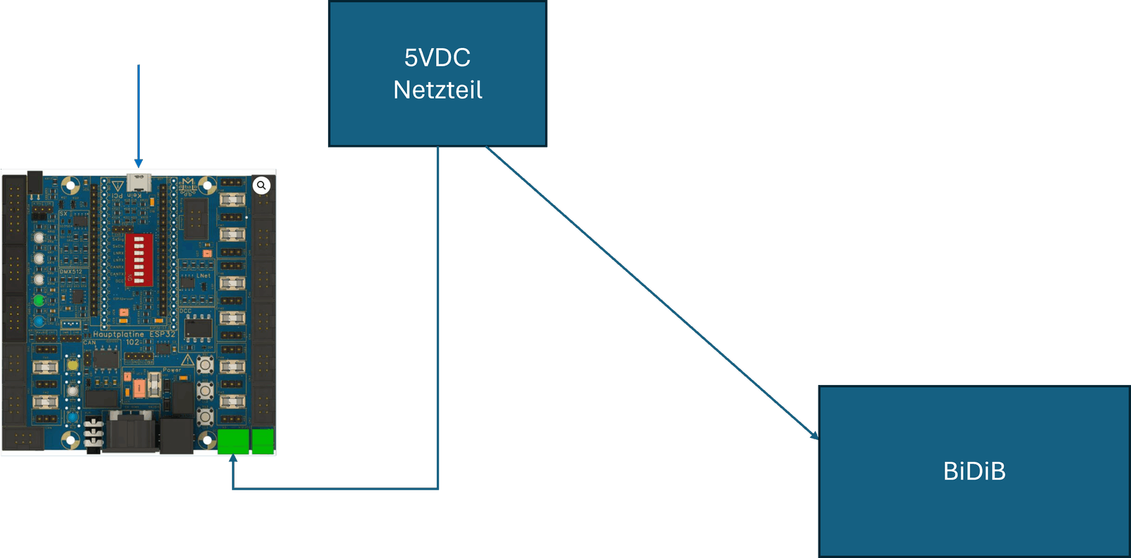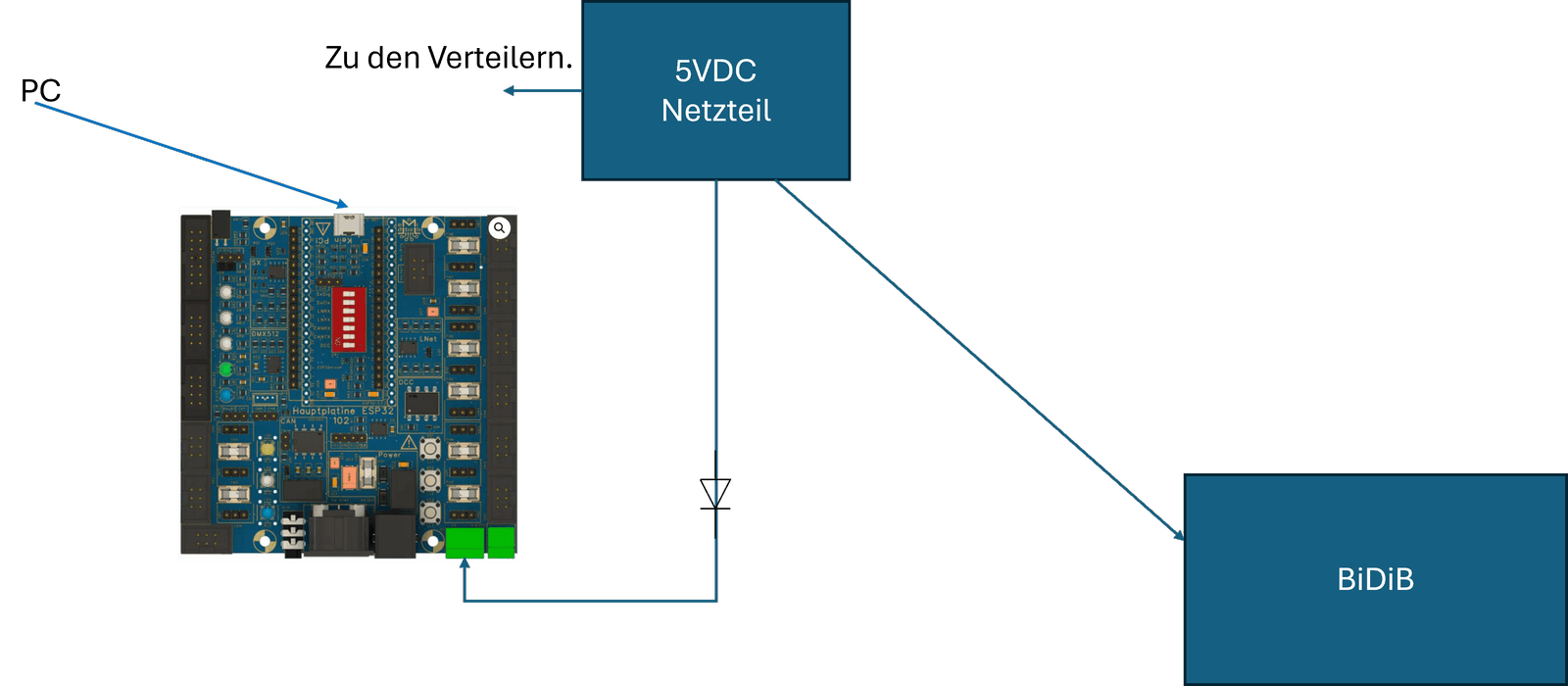 Am Nano oder ESP hängt immer ein USB-Kabel, an das ich bei Bedarf zum Programmieren mit dem Isolatormodul das Notebook anschließe, immer zusätzlich zur Stromversorgung der Anlage. Nano und ESP bleiben immer auf den Lichtmaschinen. Alle Eingänge der Anlage hängen am Sicherungsverteiler Pro.