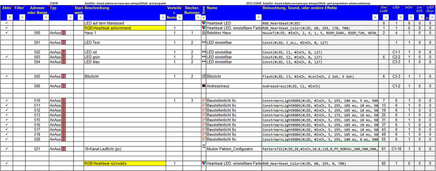 Wichtig ist, bei 10 Leds sind 30 Kanäle zu definieren und damit der Simulator nicht 30 Kanäle anzeigt, ist der Haken (rot markiert) bei RGB Led zu setzen. Die Farbe in den ersten 3 Reihen ergibt sich aus der Füllfarbe im 1. Feld. Hat in diesem Fall keine Bedeutung.